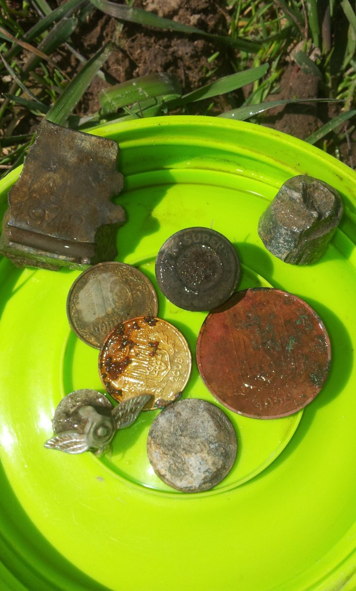 всем привет. Сегодня прогуливался по Константиновке. Цари попрятались или кончились) Зато инструмента и крепежа набрал, жменю алюминиевых болтиков. Порадовал кузнечный молот, очень собака, тяжелый. Попался антуражный осколок с годом 1942 и петличный значек на гайке, помятый малость. К знатокам - чьих будет? Видел камрада по воде копал, достала суша - зашел по горло)