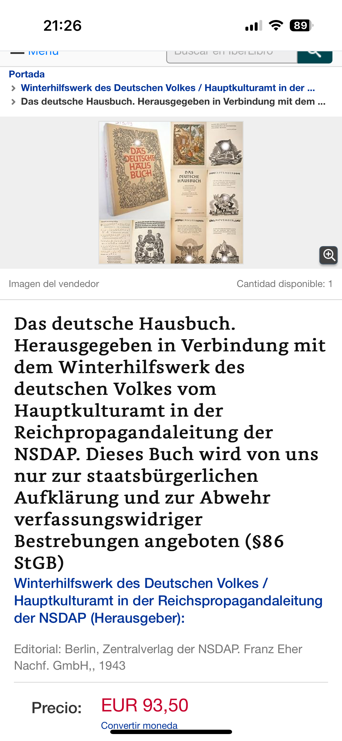 В Германии "Моя борьба" стоит 100 евро - одна из самых дорогих по Рейху. Если за вашу кто даст 5 евро - отдавайте и убегайте! Вот стоит книга с фото боёв - https://www.ebay.de/itm/30544350618...RGN39F&hash=item471dda080a:g:J~gAAOSwWJFl7f8c - 1 евро. Не берут....