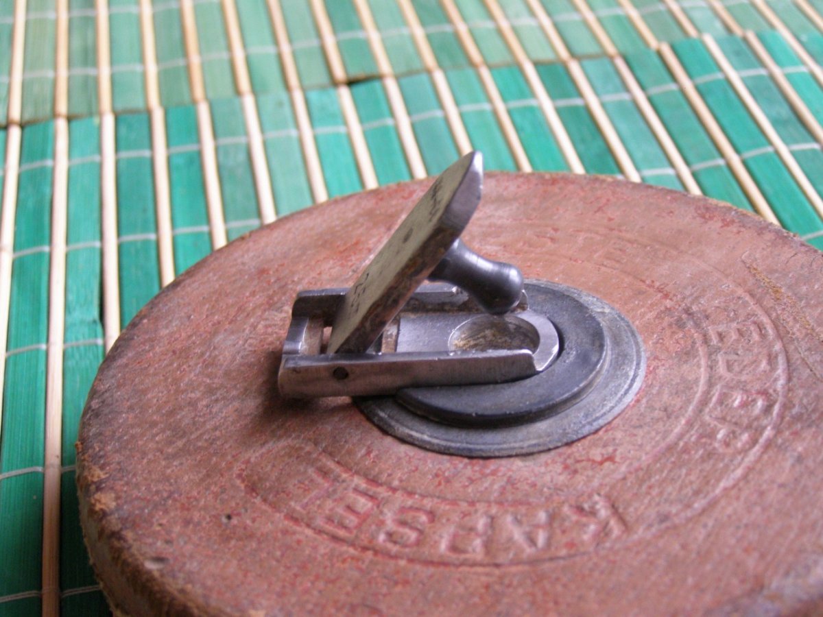 Моє вітання всім камарадам! Оцініть , будь ласка, даний предмет. Колишній власник приніс його додому з війни в якості трофея і використовував потім за прямим призначенням - робив "верхи" на хатах.Тобто - теслював (плотничал). Стрічка ВІДСУТНЯ. Корпус перебуває у досить пристойному стані. Виготовлений з товстої оцинкованої бляхи.При на тисканні не прогинається і не клацає. Обтягнутий свинячою шкірою. Шкіра не пересохла, не потріскана, збереглося багато рідного фарбування і тиснення.Є в одному місці втрата по нитках - від пото-жирових виділень шкіри рук (великого пальця). Ручка-фіксатор - з дюралю, барабан- з заліза (все почистив дремелем). Ручка не бовтається і фіксується під любим кутом. Всі клейма чіткі. Тиснення на шкірі потерте, але читається добре:"BESTE LEDER KAPSEL". У перекладі з нім. - "КРАЩА ШКІРЯНА КАПСУЛА". Виробник - фірма "MASSI" (див. фото). Сальники на отворах капронові, без тріщин. Сидять міцно. Всередині корпусу окислення цинку НЕМА. Отвір рулетки розрахований на стрічку шириною 12мм. У вермахті менша за розміром рулетка входила до комплекту разом із сокирою "Klauenbeil" і носилася разом у спеціальному відсіку кобури. Буду вдячний за Ваші коменти та оцінювання!