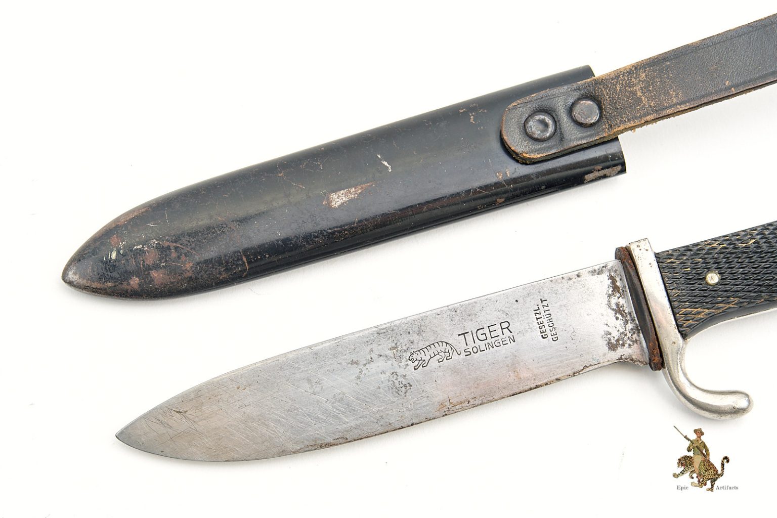 Я думаю, что нож этот оригинальный, но послевоенный, так называемый Pfadfindermesser или нож скаутский. Было такое движение в послевоенной Германии. Его стоимость "утяжелили" лазерным написанием лого производителя "Tiger" и девизом "Blut und Ehre". Ромбик