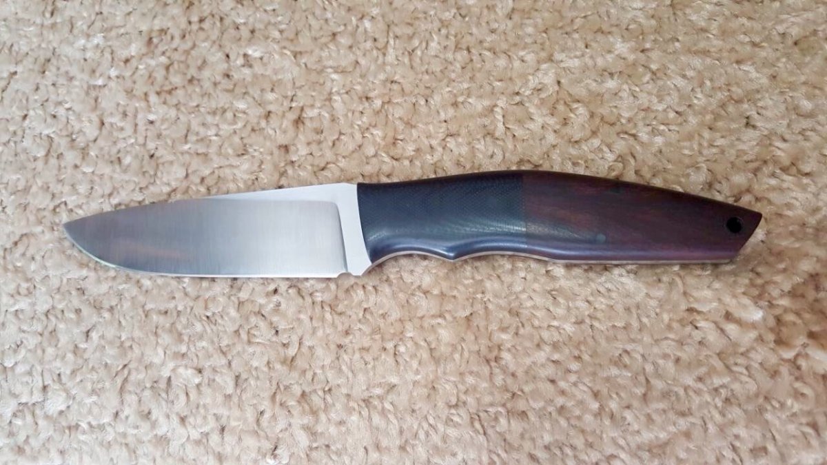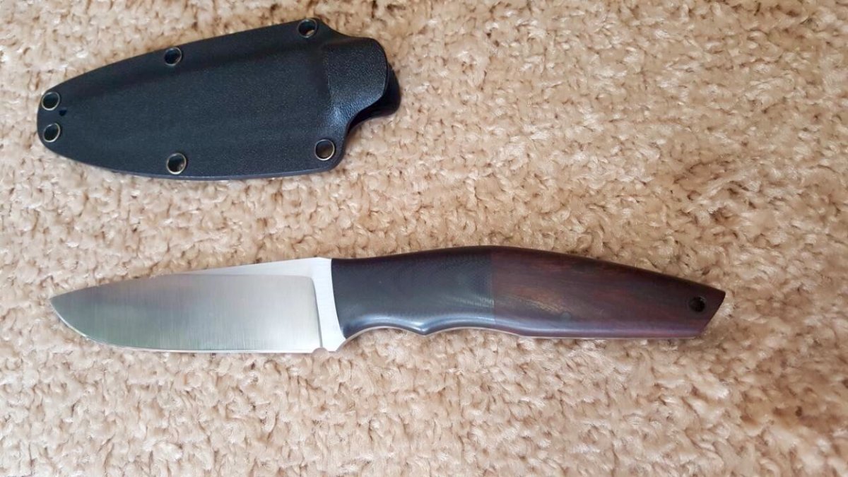 Клинок N690 з ТО Андія Гаврика на 61 од, спуски прямі, зведені в 0.4мм. Розміри: 110*32*3.5, руків^я- комбіноване G10 і Ironwood, піни-Карбон. Загальна довжина 228мм. Піхви-кайдекс.