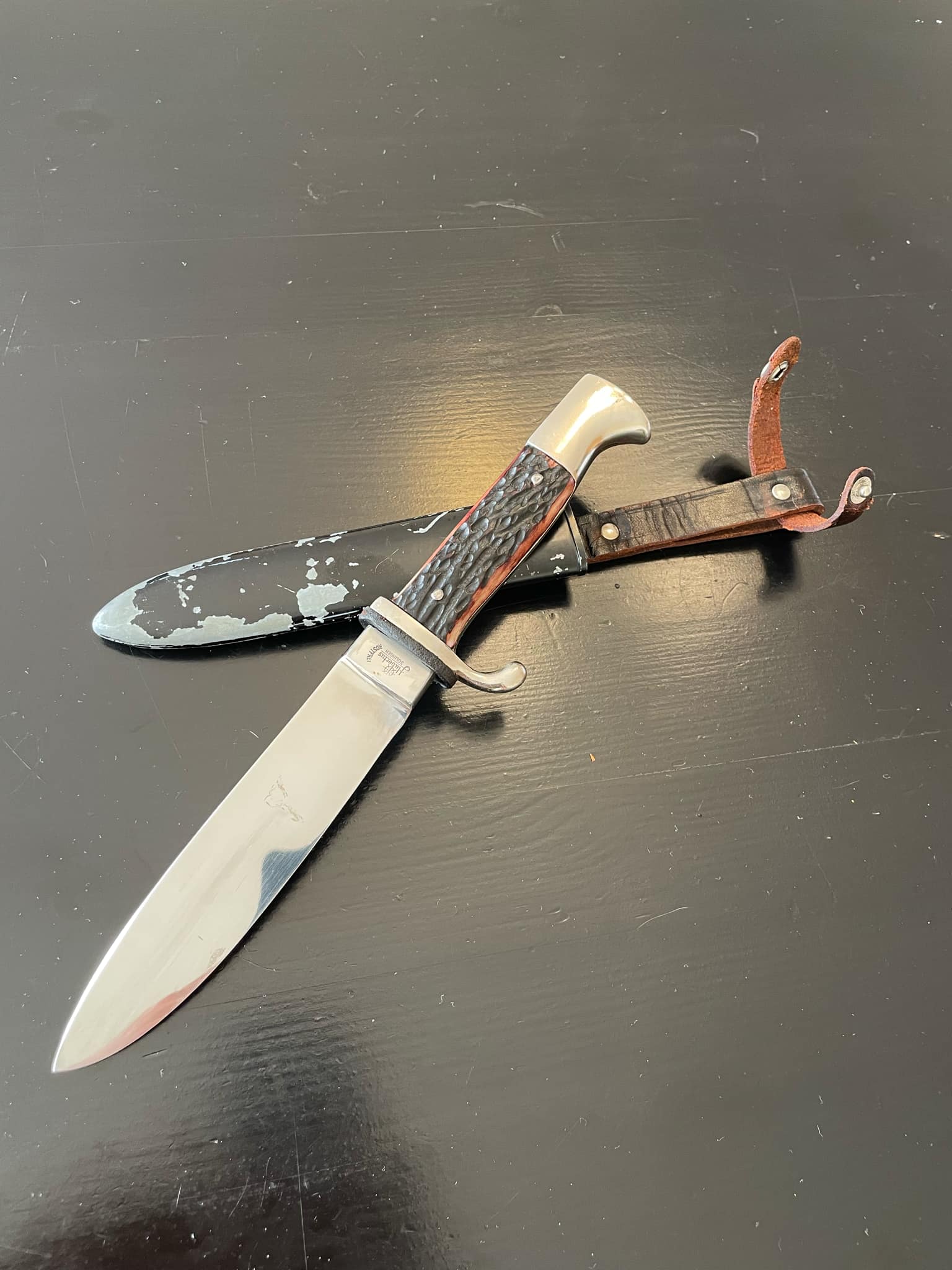 60 годы. Нож заполированный. Накладки заменили на аля олений рог(поляки любят для веса) Подвес не магнитится, как мне видится подвес и ножны то же 60 годы.