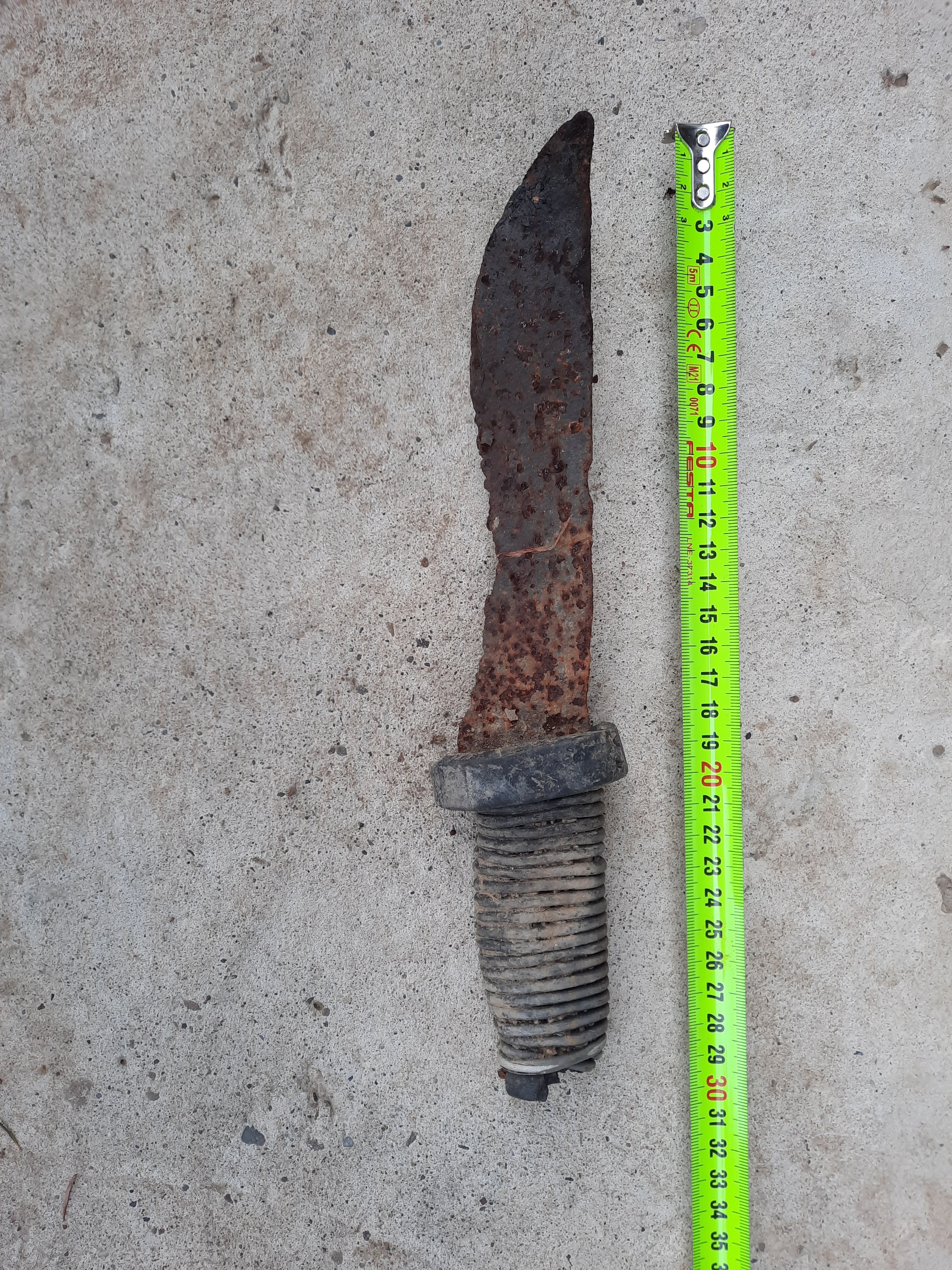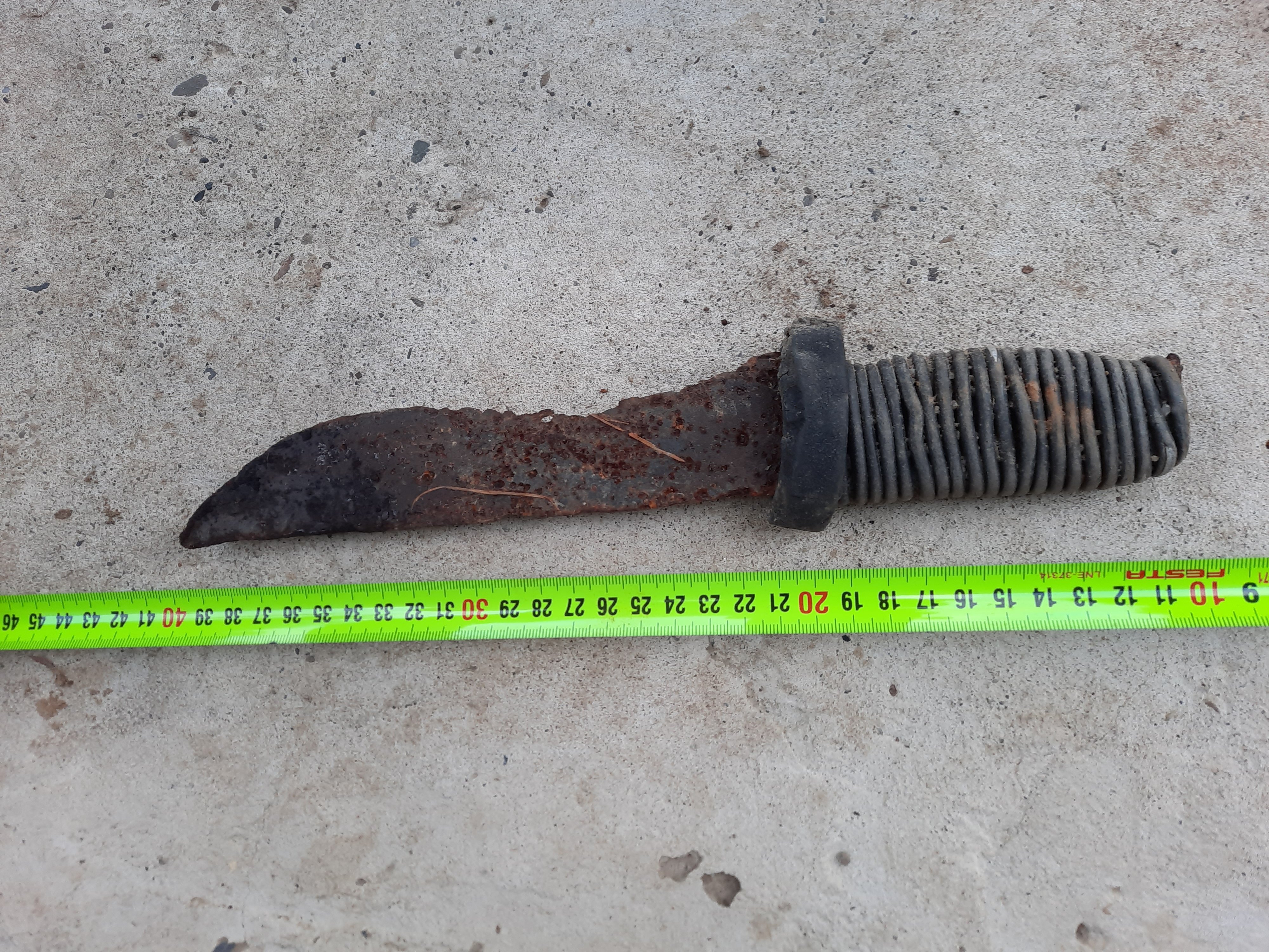 Вітаю.Пройшовся по полотні розібраної вузькоколійки,що діяла у минулому сторіччі.Попадалися різні деталі:костилі,піставки під рейки,кілька гільз мавзера та манлихера.Найцікавішою знахідкою став саморобний ніж великого розміру.Зреблений з тоненької пластини,але ще й тепер пружинистий...