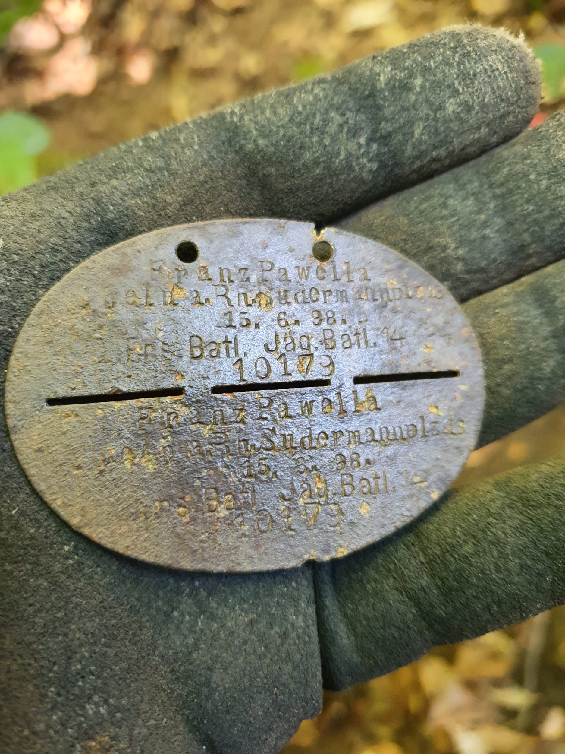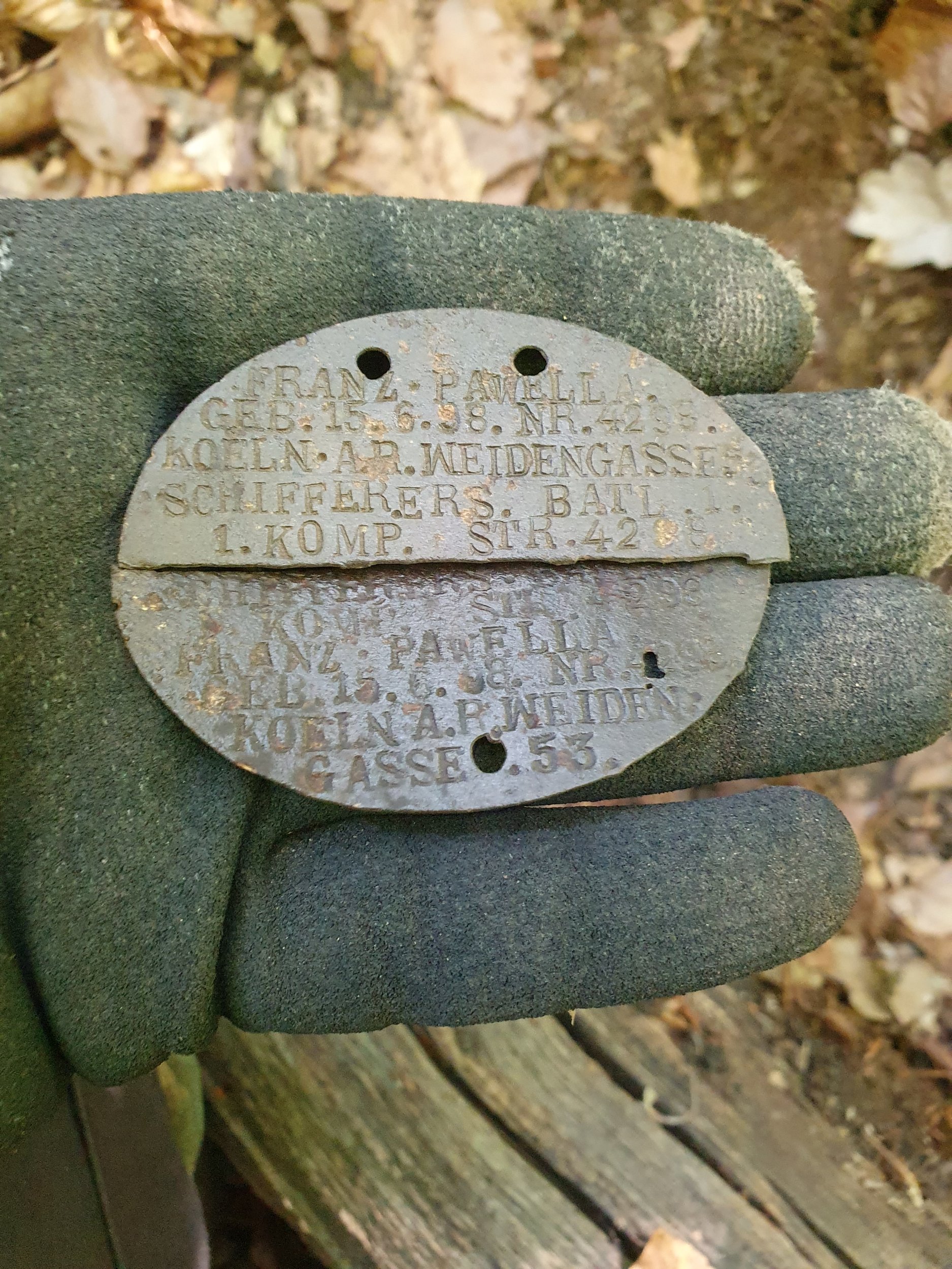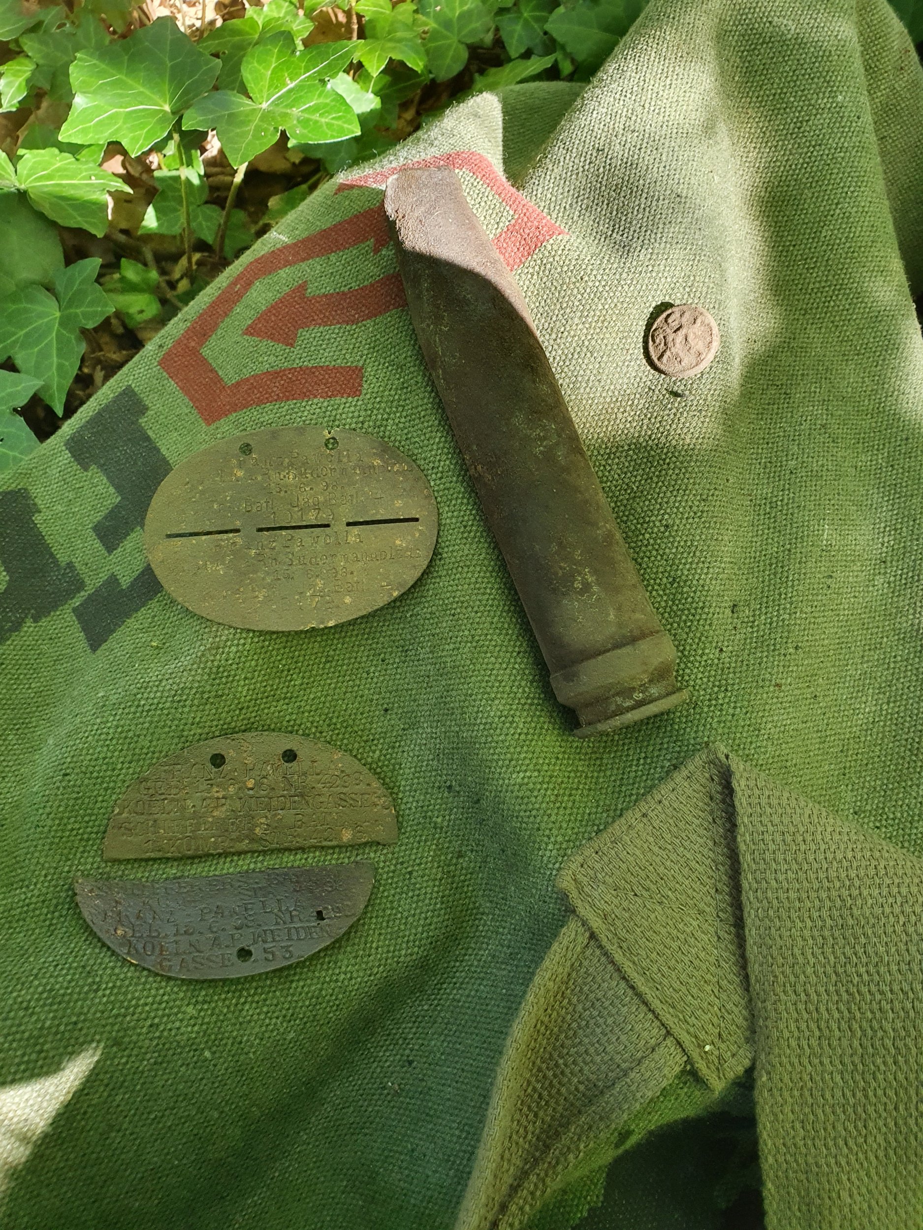 Перший жетон, ім'я прізвище, рік народження, адреса проживання, 1 ерзац батальйон, 14 егерстький батальйон. другий жетон, те саме ім'я..., 1 ерзац (запасний) батальйон, 1 рота. Цікаво, обидва жетони однієї людини.