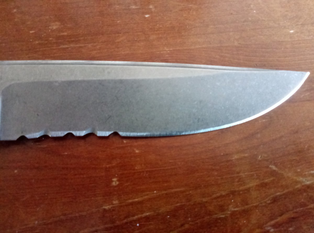 Качественная реплика на красивый охотничий нож. Заточка комбинированная plain+serrated Технические характеристики: клинок заявлен d2(stonewashed), длина 110мм общая длина: 224 mm толщина обуха 4.6mm на рукояти дерево (кокоболо) сам не знаю, в породах дерева не силен ножны-кожа Нож в ножнах не фиксируется. Брал один раз на природу. Ничего серьезного нож не резал. цена 550 грн. Так же возможен обмен.