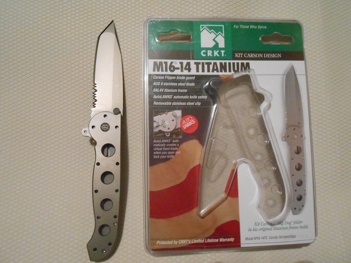 Продам новый нож CRKT M16-14T . Не использовался.Не разбирался Не точился и не правился.Цена 3200 грн. ТТХ Нож CRKT M16-14T - Tanto - Designed by Kit Carson Длина ножа в раскрытом положении: 23,5 см Длина ножа в сложенном положении: 13,3 см Вес ножа: 167 грамм Длина клинка: 9,85 см Толщина клинка: 3,5 мм Сталь клинка: AUS 8 Твёрдость стали: HRC 58-59 Покрытие клинка: Bead-Blast Тип продольного сечения клинка: Hollow Клинок: Tanto Серрейтор (зубцы): Triple-Point Serrations Материал рукояти: Titanium Сталь лайнера: 420J2 Тип замка: Locking Liner Система безопасности: AutoLAWKS Клипса: 1 позиционная