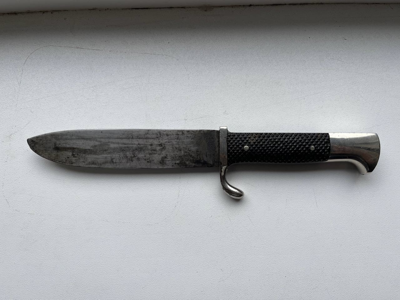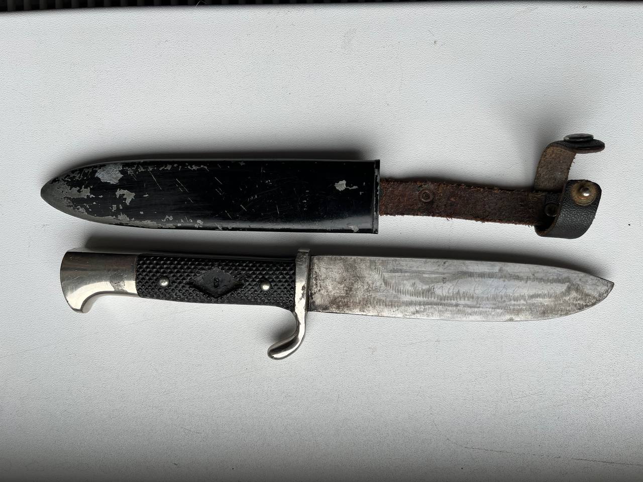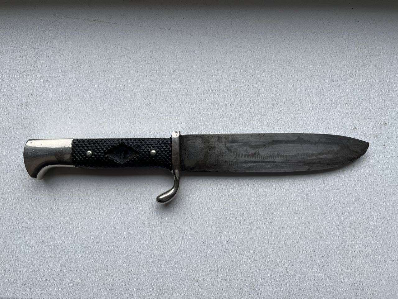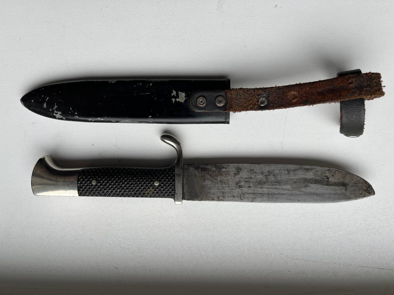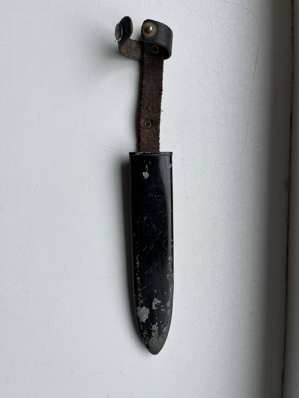 Ножны от позднего скаута 1960-70х.Сам нож оригинальный убитый ХЮ.Нож конца 1930х из последних с девизом,с клинком уже нового образца. Вероятно послужил донором ромба и ножен, накладки переклепаны кустарно на родных заклепках.