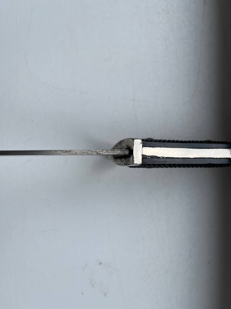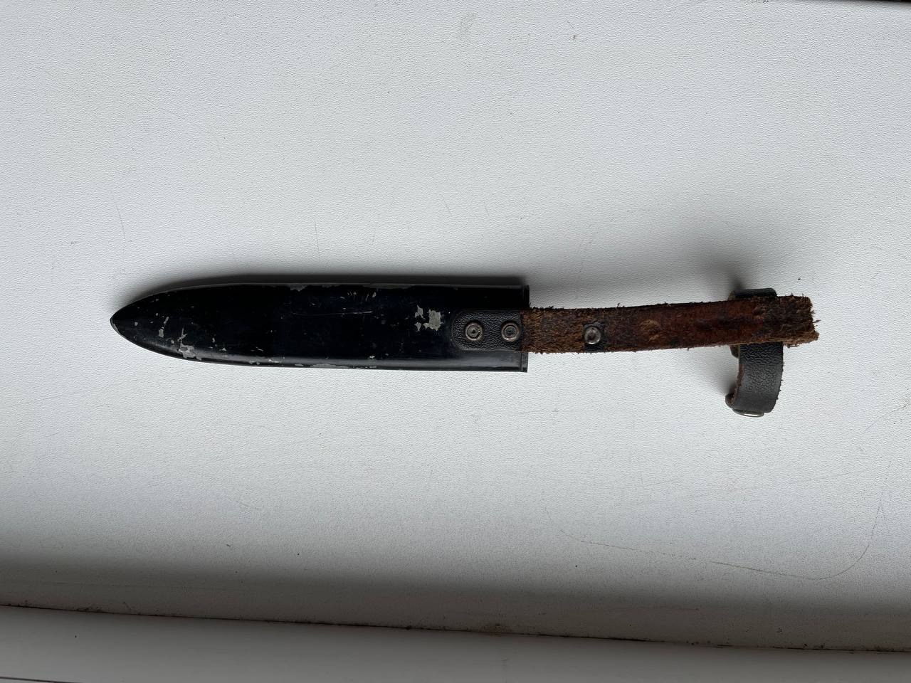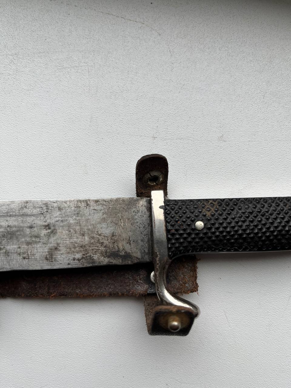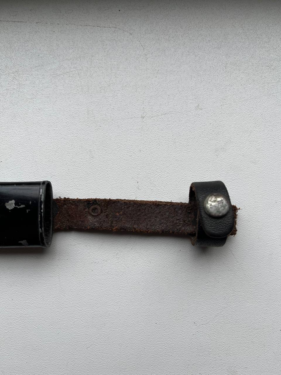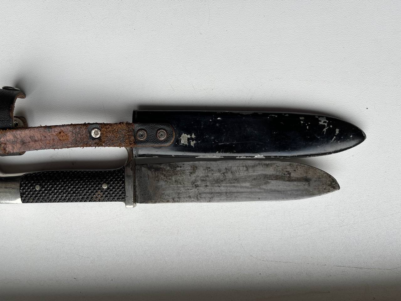 Ножны от позднего скаута 1960-70х.Сам нож оригинальный убитый ХЮ.Нож конца 1930х из последних с девизом,с клинком уже нового образца. Вероятно послужил донором ромба и ножен, накладки переклепаны кустарно на родных заклепках.