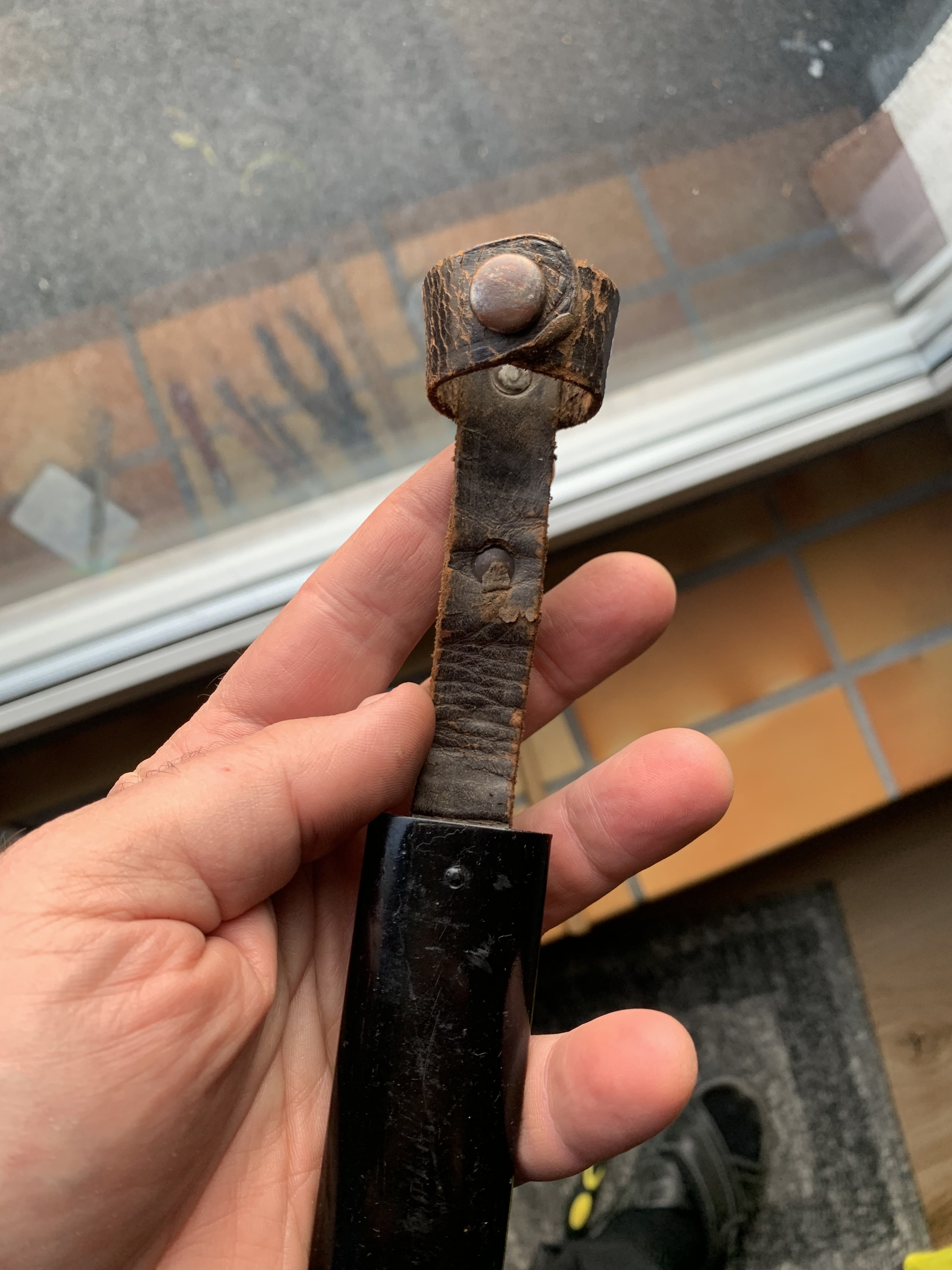 Приветствую. Достаточно нечастый производитель. Ранний нож. Состояние и самого клинка и ножен весьма приличное. Из минусов - битый ромб.