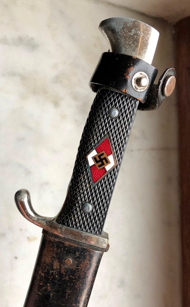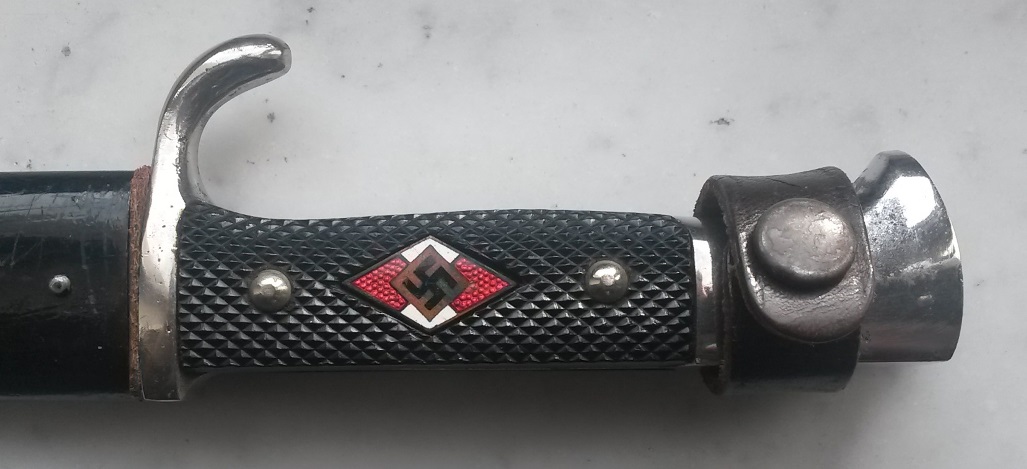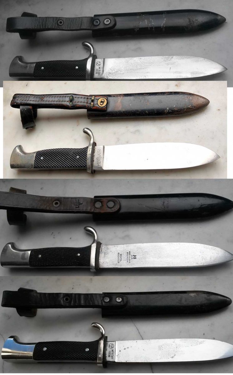 Такое впечатление,что их Гансмит какой-то продает или ремточмеханика,губы накрашены-оба ножа наполированы и натерты аж горят,что вовсе не увеличивает их коллекционную ценность,девиз думаю клевером подвели,уж больно яркий,кроссшлифовка утрачена полностью.Заклепки опять не пойми что,похоже та же люминь,скорее всего вставляли ромб,как и в первом случае,т.к.ножи были денази.Знак согнут,это явно видно,стало быть ромб не с этого ножа,по размеру он явно больше чем должен быть,не влазил,вот и согнули.Все остальное вроде ок.