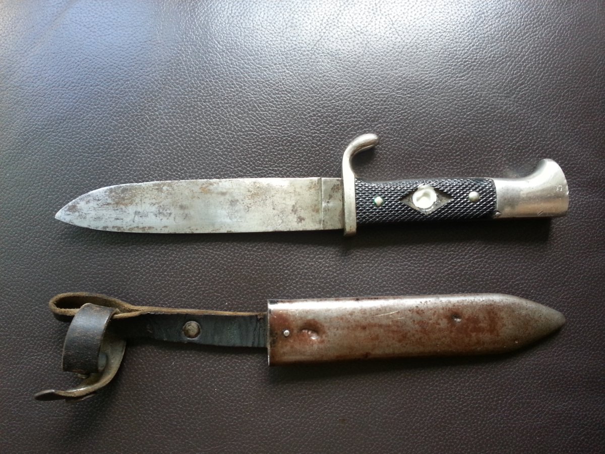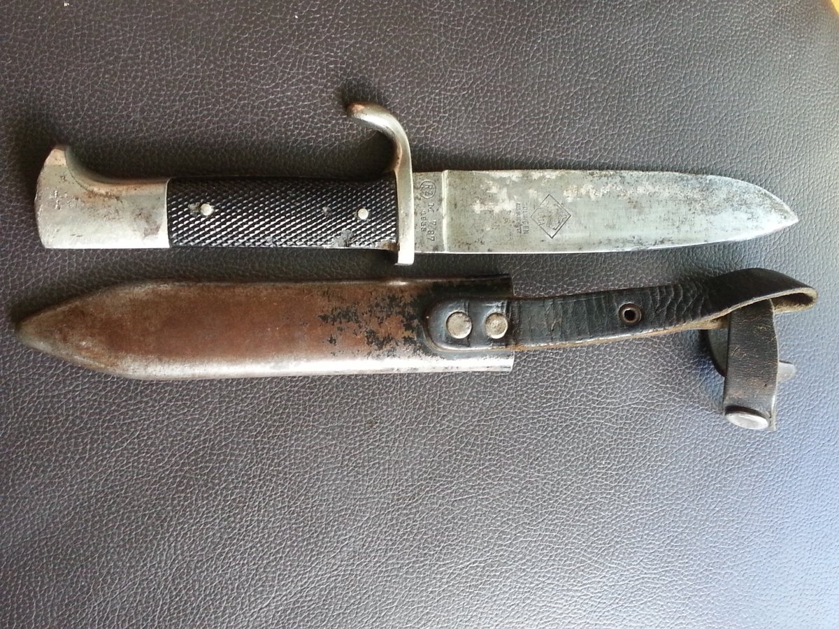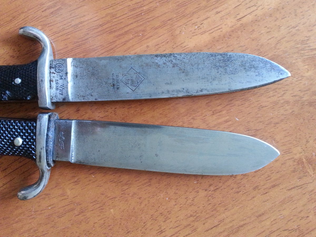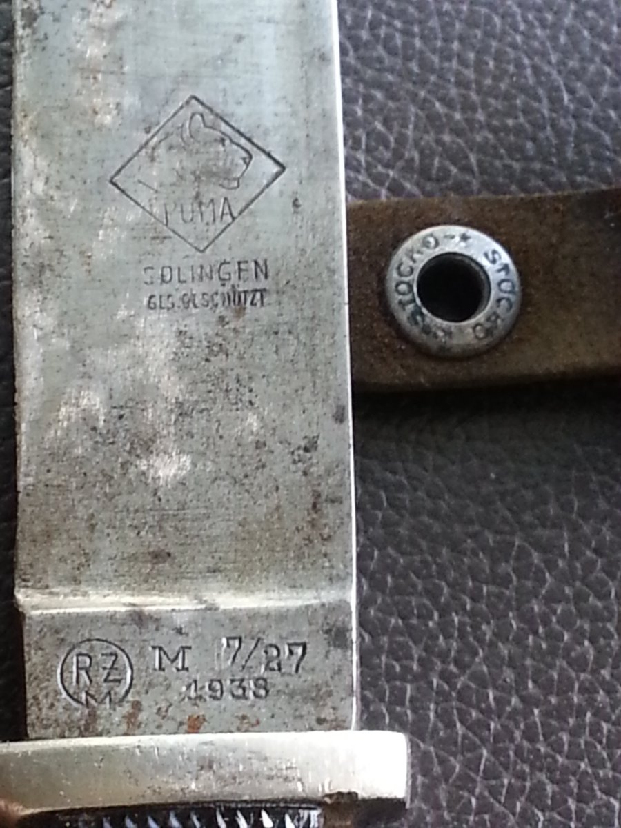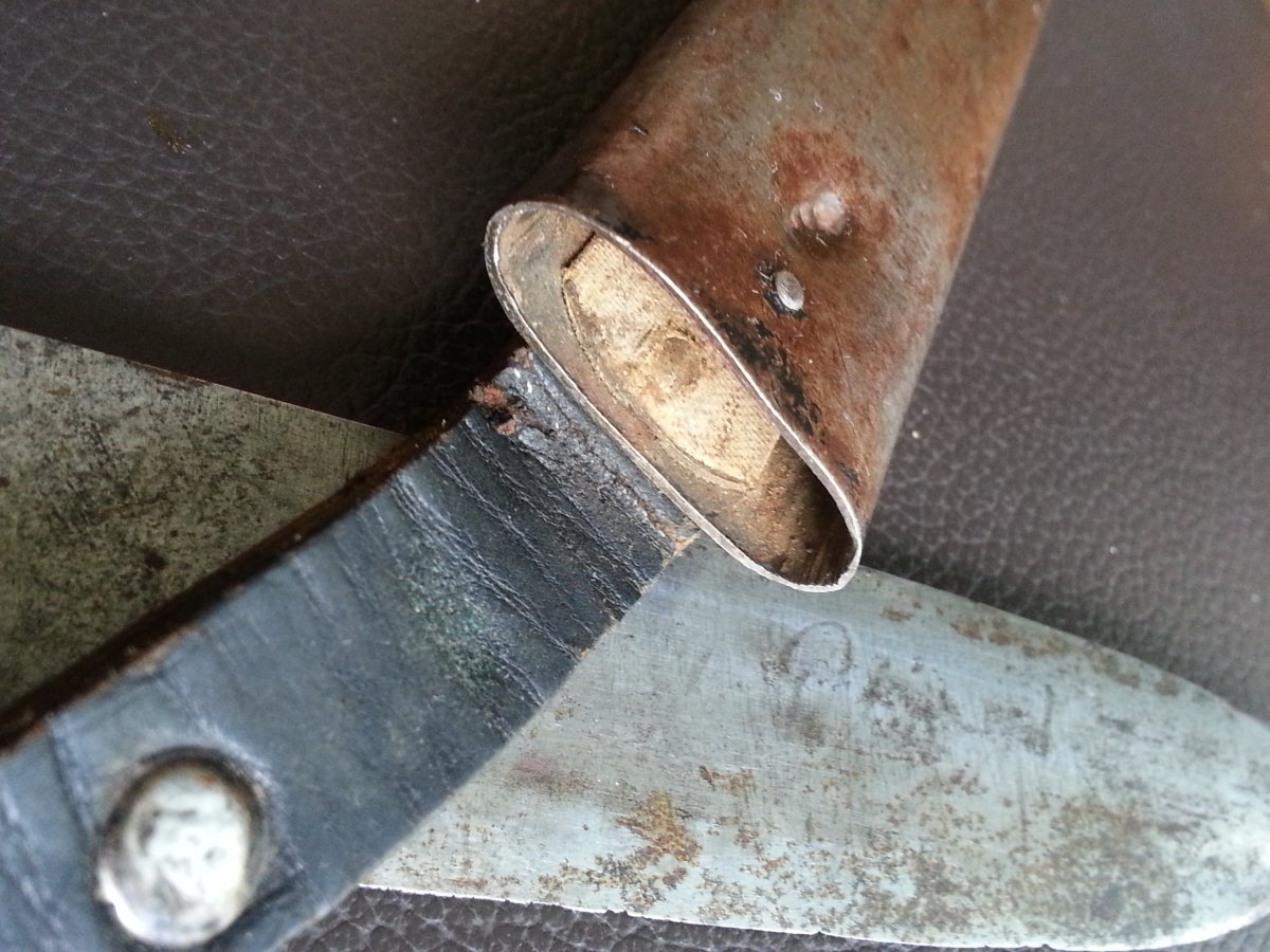 Попался вот такой ножичек. В общем обычный уставший нож уставший. Девиз почти стерт.Единственное что радует это состояние кожи подвеса и материал на пружинах. Вопрос по геометрии клинка. Это следы заточки и бытования или они отличались. Что можно сказать по клейму. с ув