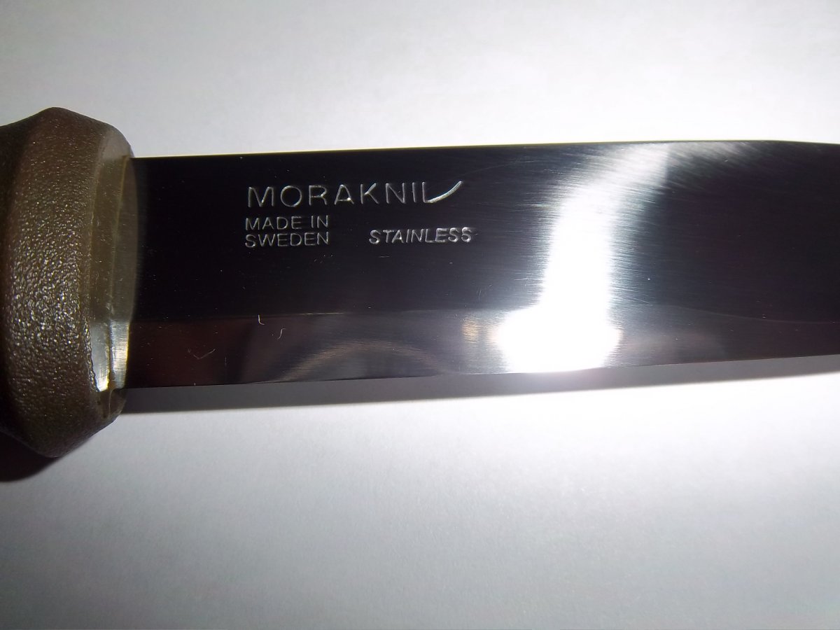 Клинок ножа изготовлен из шведской нержавеющей стали марки Sandvik 12C27, заявленная твёрдость стали HRC 57-58. Полная длина клинка чуть больше 114 мм, ширина на уровне 24 мм, максимальна толщина на обухе — 2.5 мм. Нож выделяется геометрией клинка, которую можно встретить в современных моделях Mora Bushcraft Forest, от середины клинок сужается, толщина обуха в этом месте не превышает 1 мм, ширина спусков уменьшается практически вдвое. Рукоятка литая, изготовлена из лёгкого и твердого темно-зелёного пластика, с внешней стороны покрыта тонким слоем мягкой резины с шероховатым рисунком. Максимальная ширина рукоятки около 32 мм, толщина почти 20 мм. Нож лежит очень удобно и «естественно», рукоять сужается ближе к лезвию. Рукоять спроектирована практически идеально по руке, за счет этого ножом удобно как резать, так и колоть. В наличии два цвета: оливково-зеленый и оранжевый. Цена: 579 грн