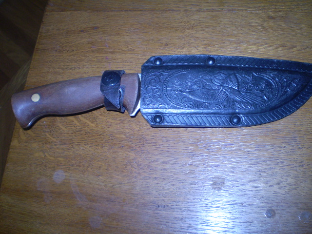 Кизляр. Их много разных, но похожих. Сталь быстрее всего 65х18 или 95х18. Твердость 55-58 или ниже. Спуски толстые. Он новым в магазине стоит 500. За БУ я бы больше 200 не дал. Зам 500 можно купить приличный нож с приличной стали. http://kizlyar.kiev.ua/catalog/75/140.html