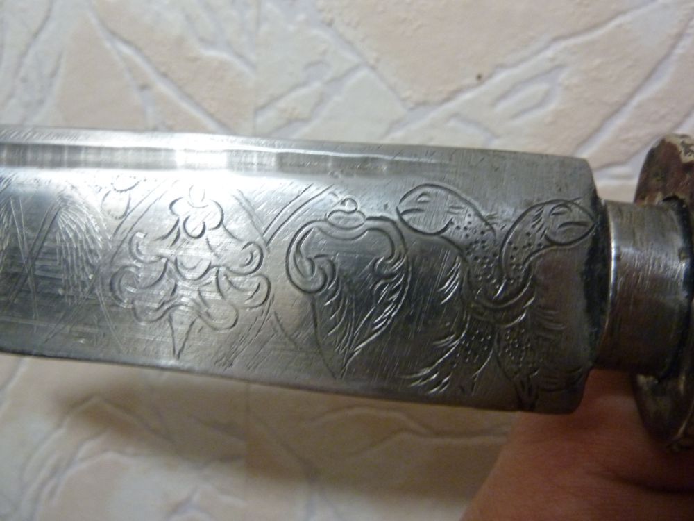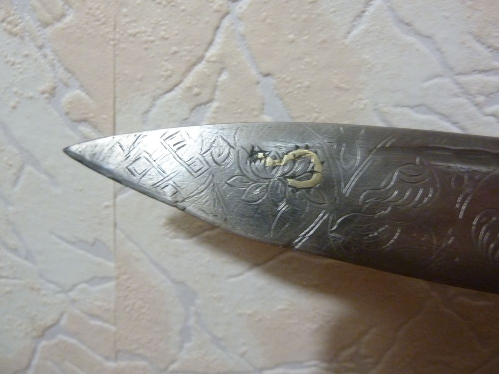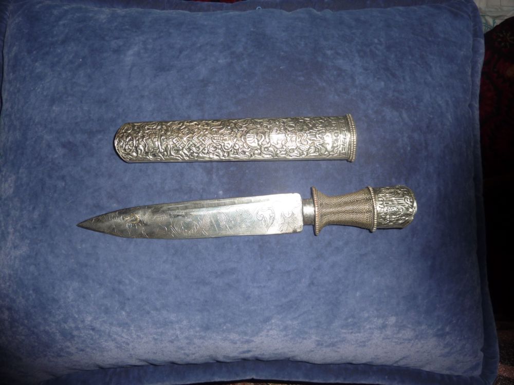 Пожалуйста подскажите по национальной принадлежности ножа и если можно приблизительной его стоимости, мой товарищ купил его как тибетский, дерево внутри ножен похоже на старое, на лезвии вкован какой то иероглиф, метал отделки не серебро, но похож, сталь клинка очень хорошая