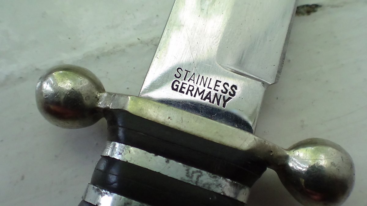 нож был привезён из Германии. общая длинна-22,5см клинок-12см обух-4мм 2250гр.
