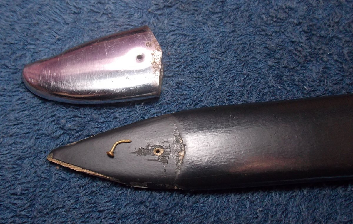 Подвес и гайка в рукояти Клейма. Удалось снять стакан ножен, держится на медном или латунном гвозде (заклепке), Обратите внимание на толщину лакокрасочного покрытия на сколе. Четкое фото внутри стакана сделать не удалось, но соединительных швов внутри нет, штамп.