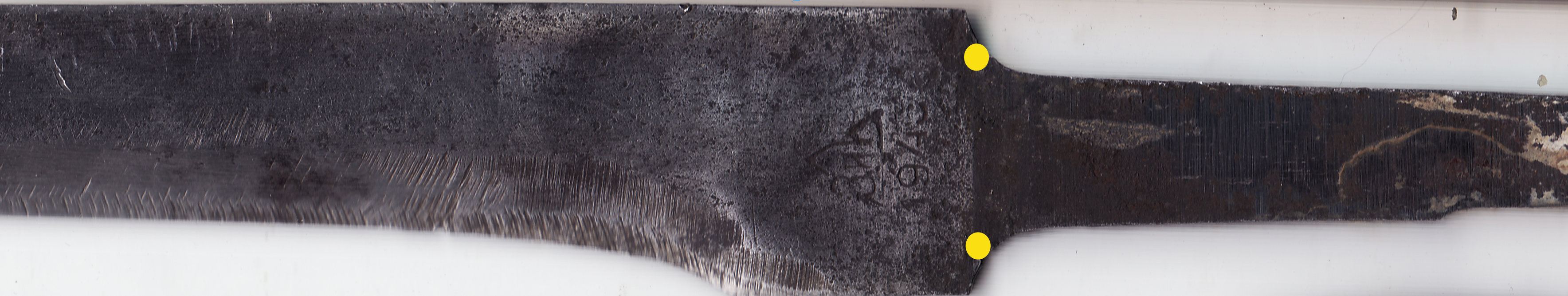 Вот гарда с 43, сам разбирал. Клин был сточен в хлам,а рукоять хорошая, она была мне нужна. Прекрасно видно,что это следы вырубки под хвостовик а не защёлки. И на клинке никаких пазов под защёлки не было,что и следует из представленного выше чертежа.