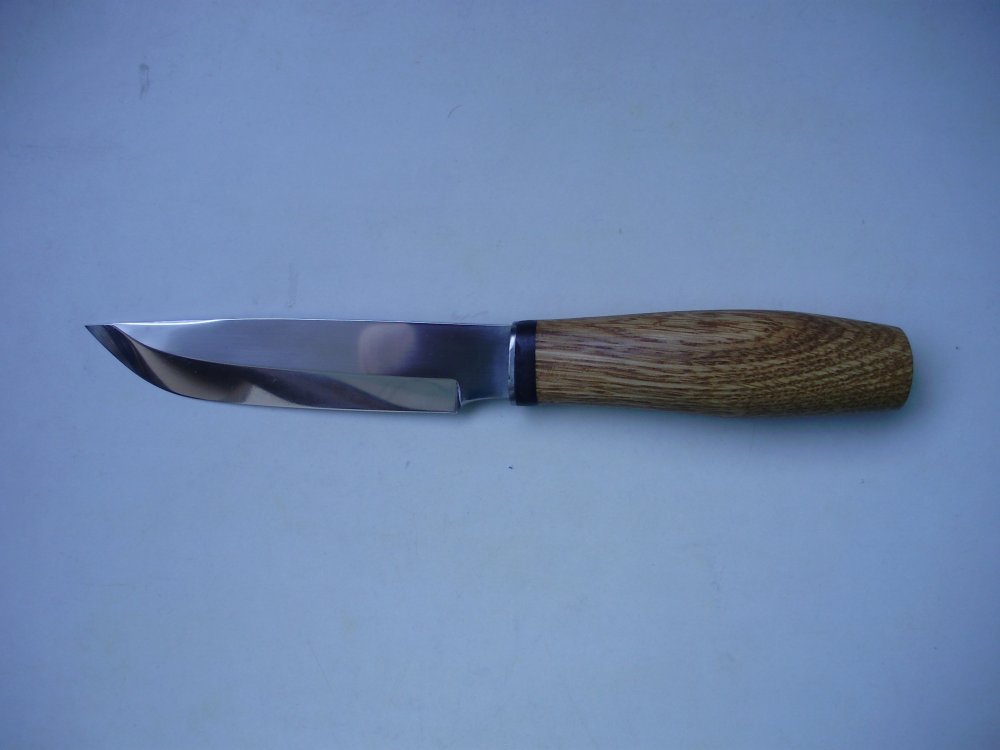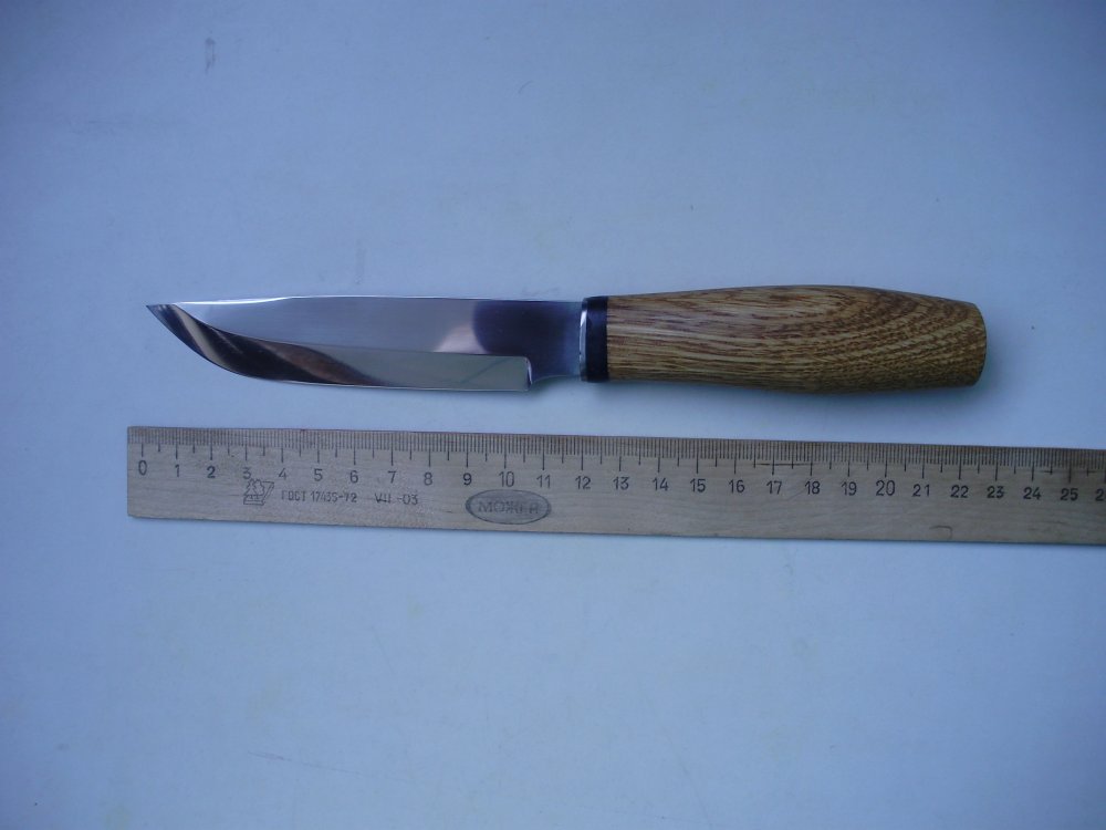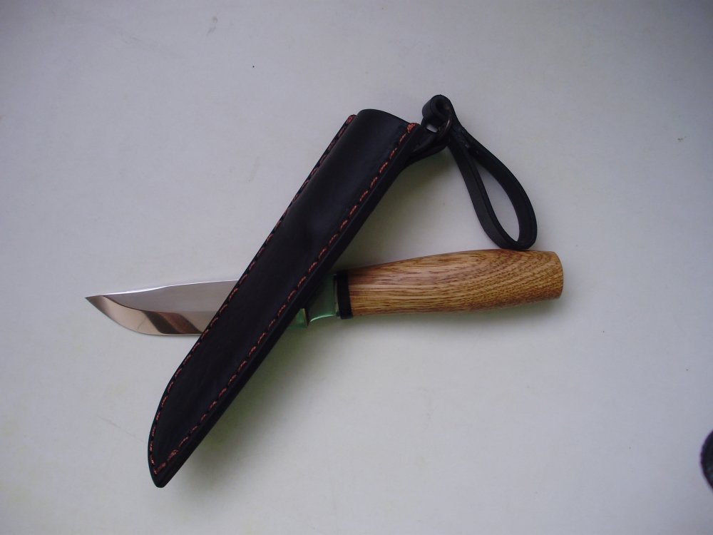 Сталь-Sandvik12C27 длина-120мм ширина-24мм толщина-2,2мм спуски-прямые в ноль(скандинавские) рукоятка-кожа,дуб,пропитка ножны-кожа,свободный подвес цена-450грн,разумный торг