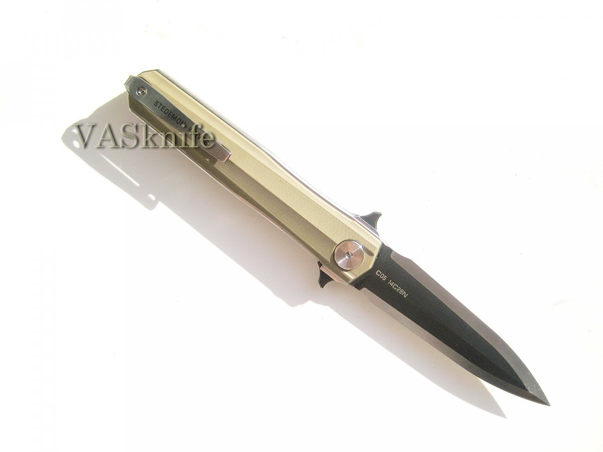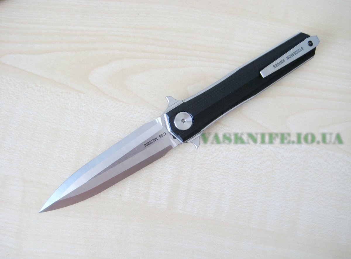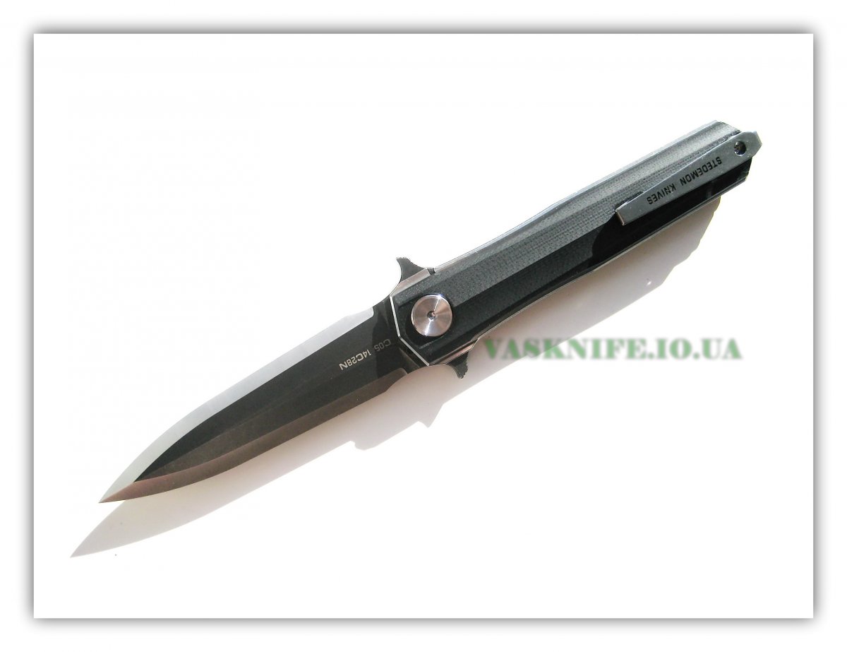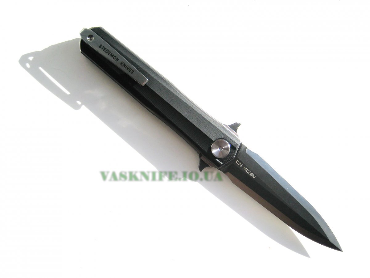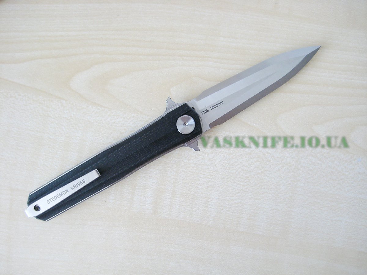 Stedemon HAN С-0501 black (satin+stonewash) + подарок (паракорд 2 м.) общая длина: 215 мм длина клинка: 95 мм длина режущей кромки (по кривой): 88 мм толщина клинка: 3.8 мм толщина спуска у рк: 0,1-0,2 мм материал клинка: 14C28N (57-58 HRC) отделка клинка: satin+stonewash материал рукояти: G-10 (black) толщина рукояти: 16 мм тип замка: Liner Lock осевой узел: керамический шарикоподшипник клипса: устанавливается в одно положение вес: 127 гр производитель: Stedemon Knife Company изготовлено: Китай доставка: бесплатно по Украине ("склад-склад" Нова Почта, Интайм) Цена: $ 48.90 (цену в гривнах можно рассчитать умножив 48.90 на курс продажи доллара Приватбанком)