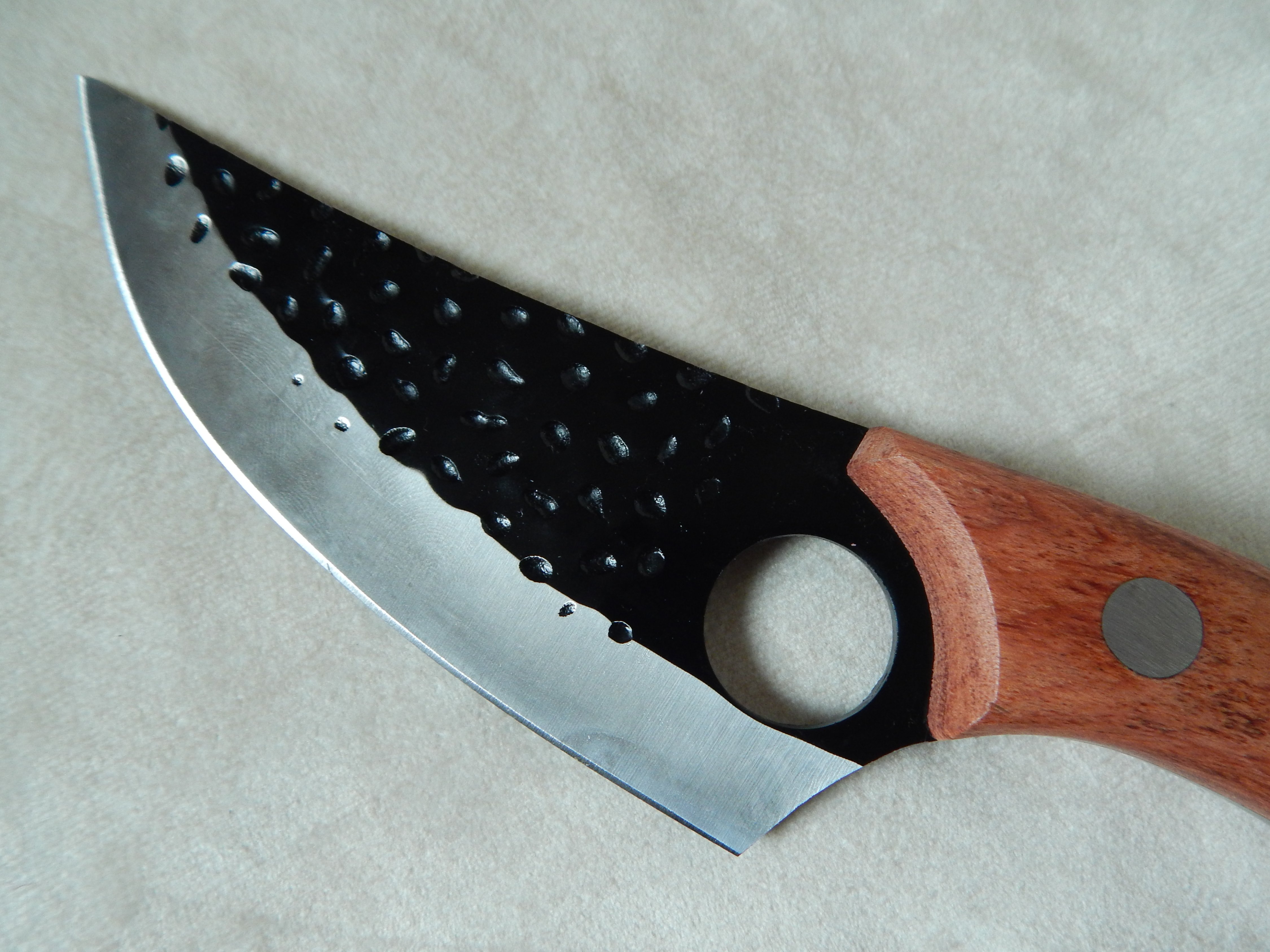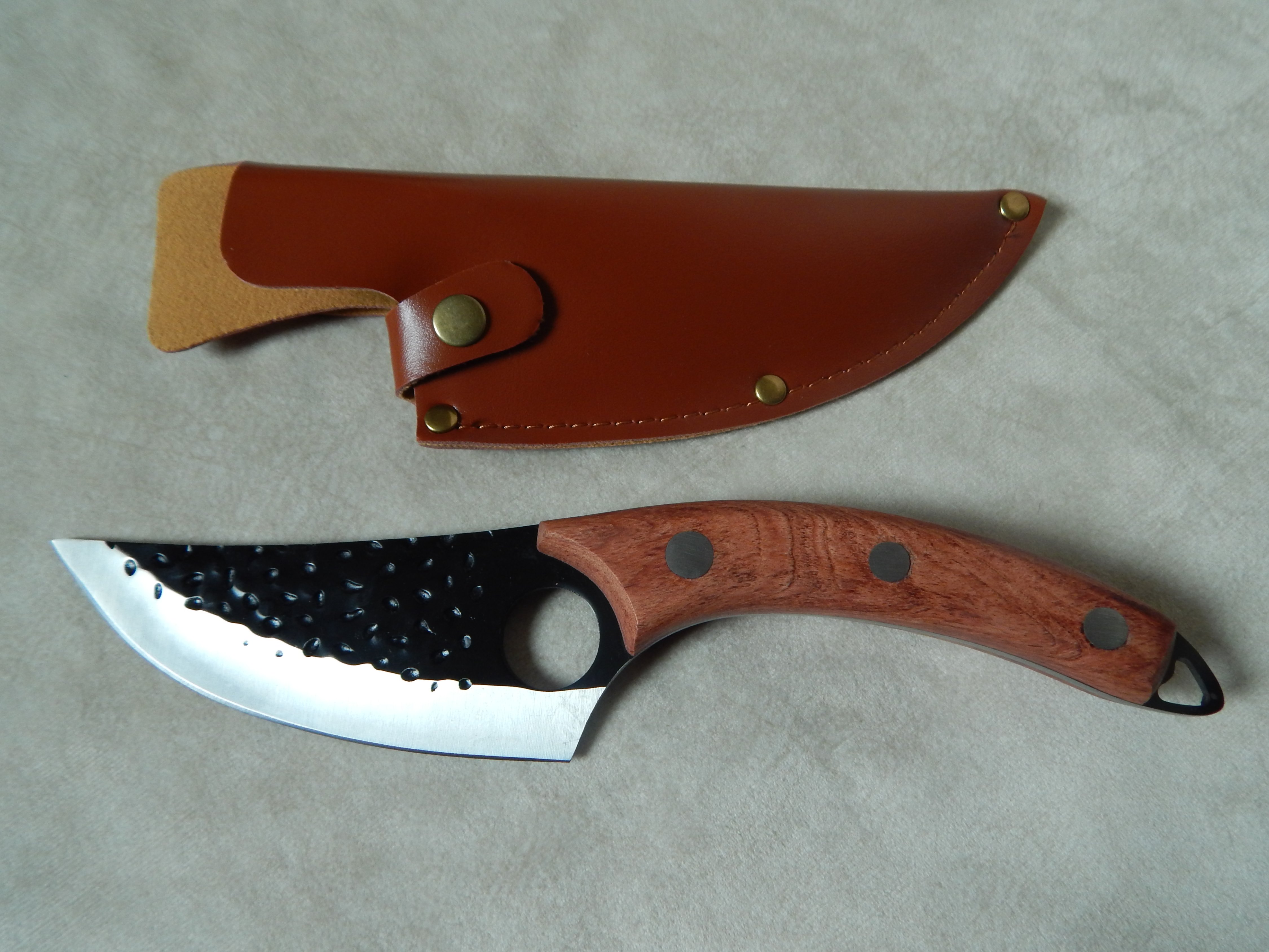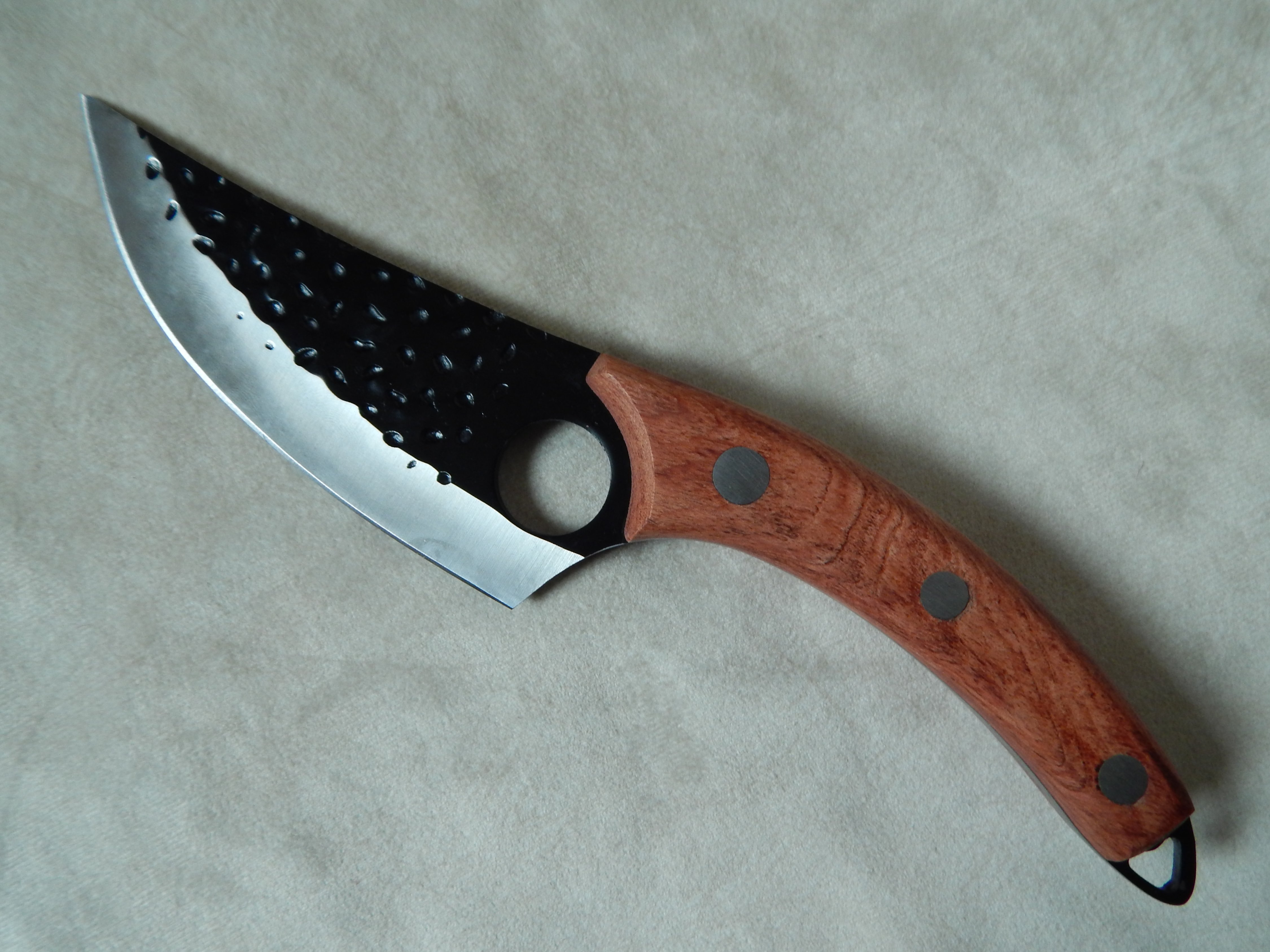 Новый универсальный кухонный и не только нож с отверстием под палец. Нож имеет деревянную ручку которая крепится с помощью 3-х заклепок. Материал лезвия: нержавеющая сталь 5Cr15Mov. Твердость лезвия: 58±2HRC. Отделка лезвия: ручная ковка Материал ручки: дерево + заклепка. Вес около 230 г (один нож) Общая длина - 26 см Толщина обуха в верхней части - 4 мм. Длина лезвия -14 см. Цена - 360 гр.