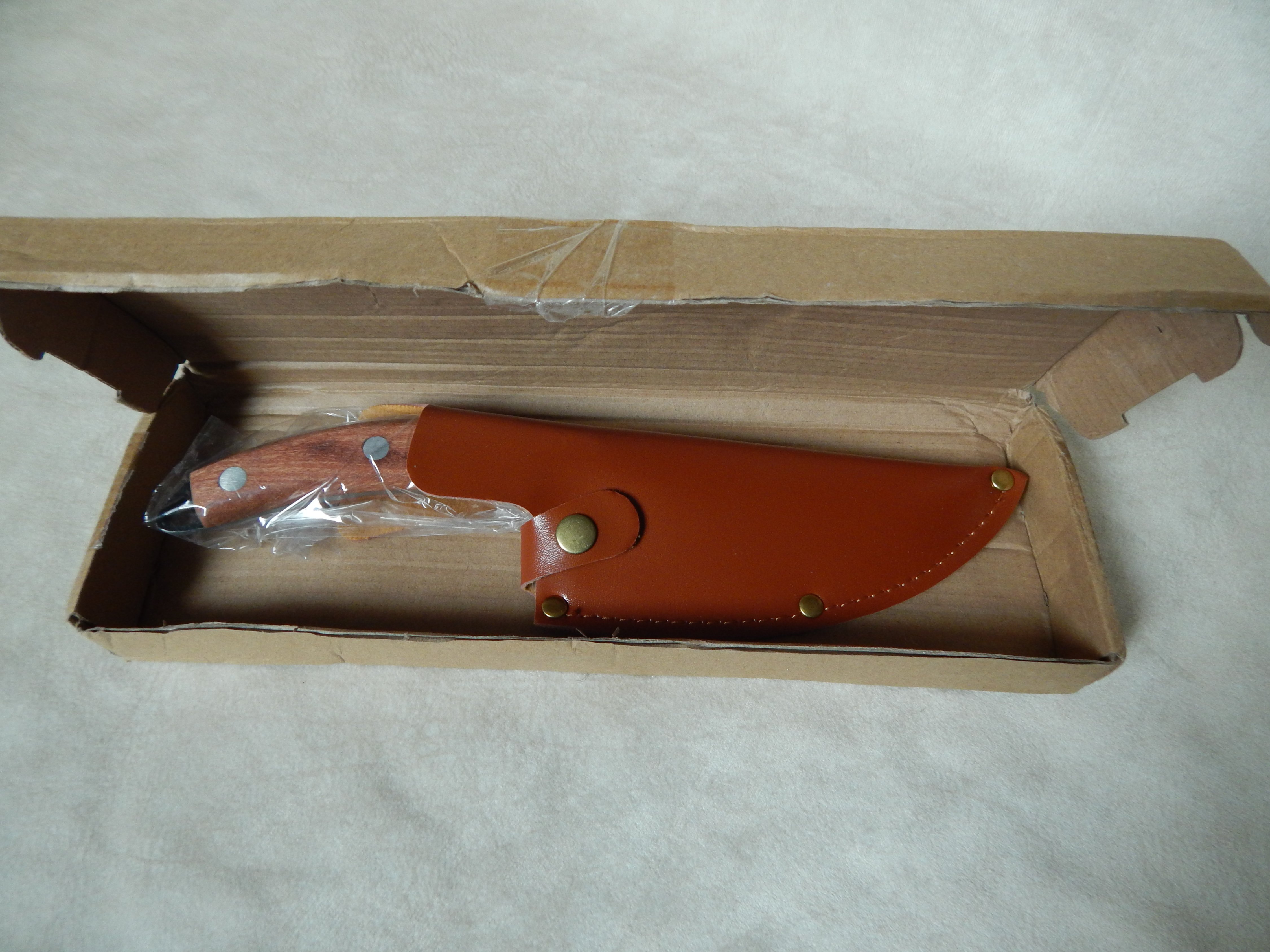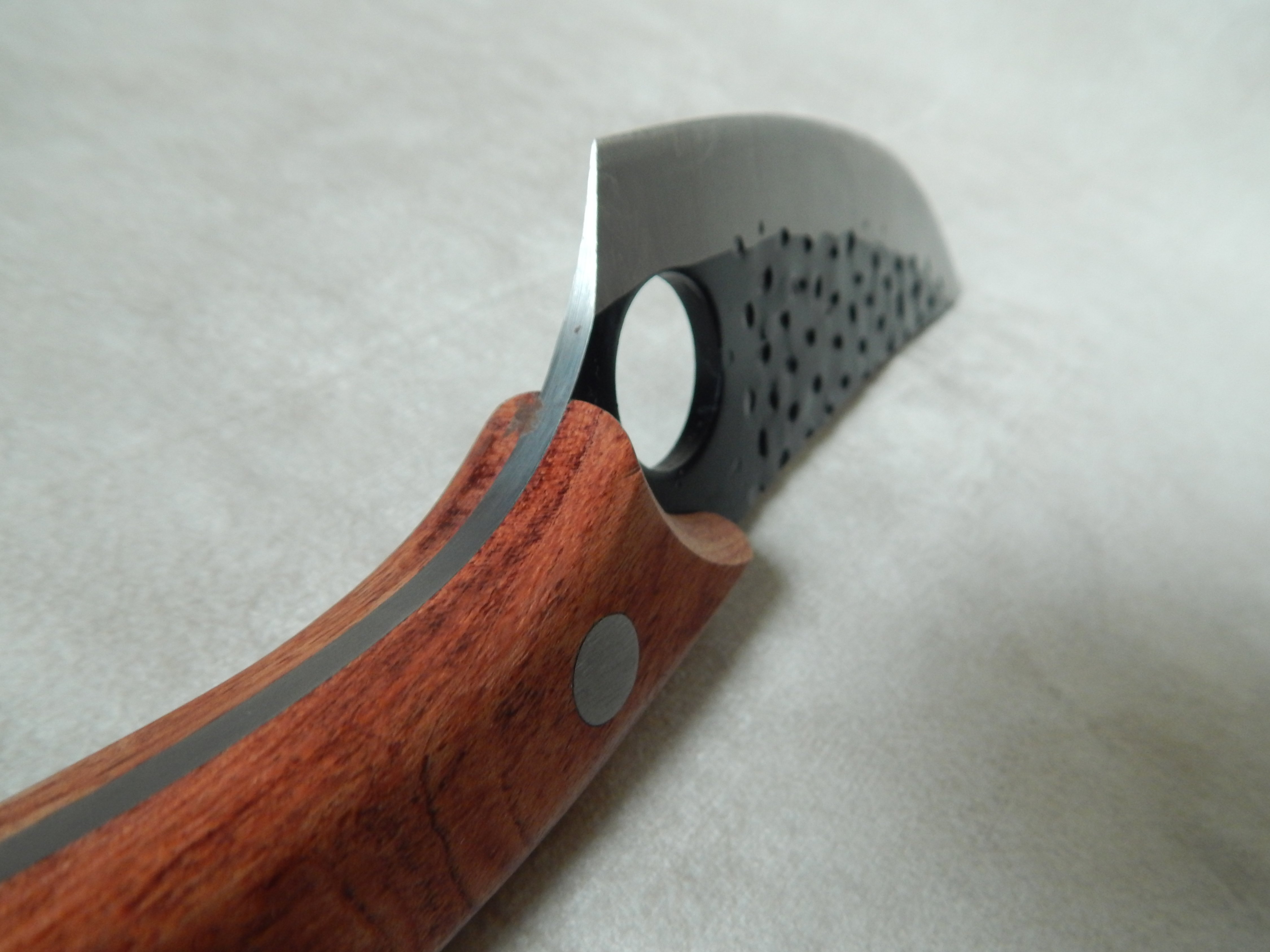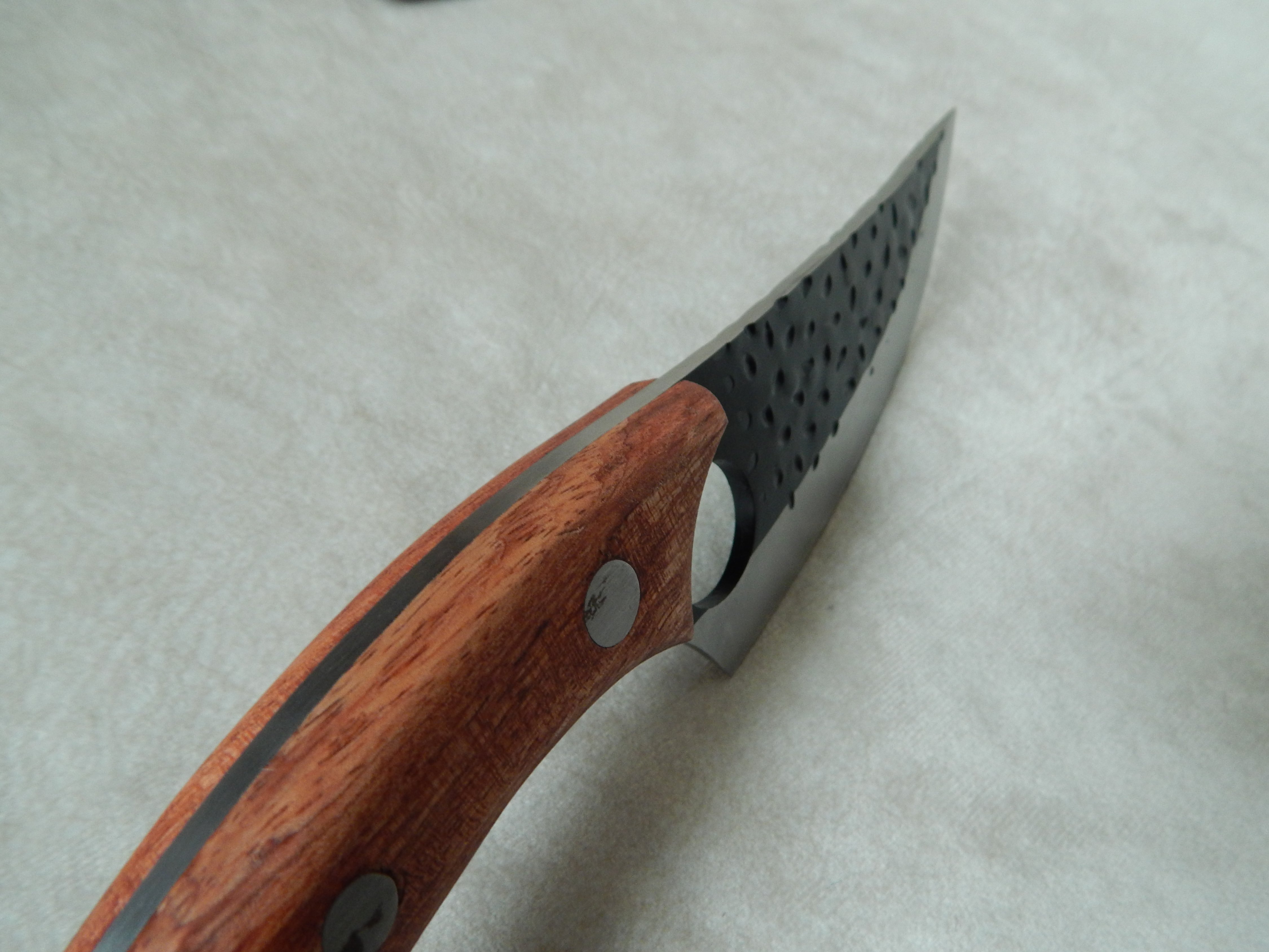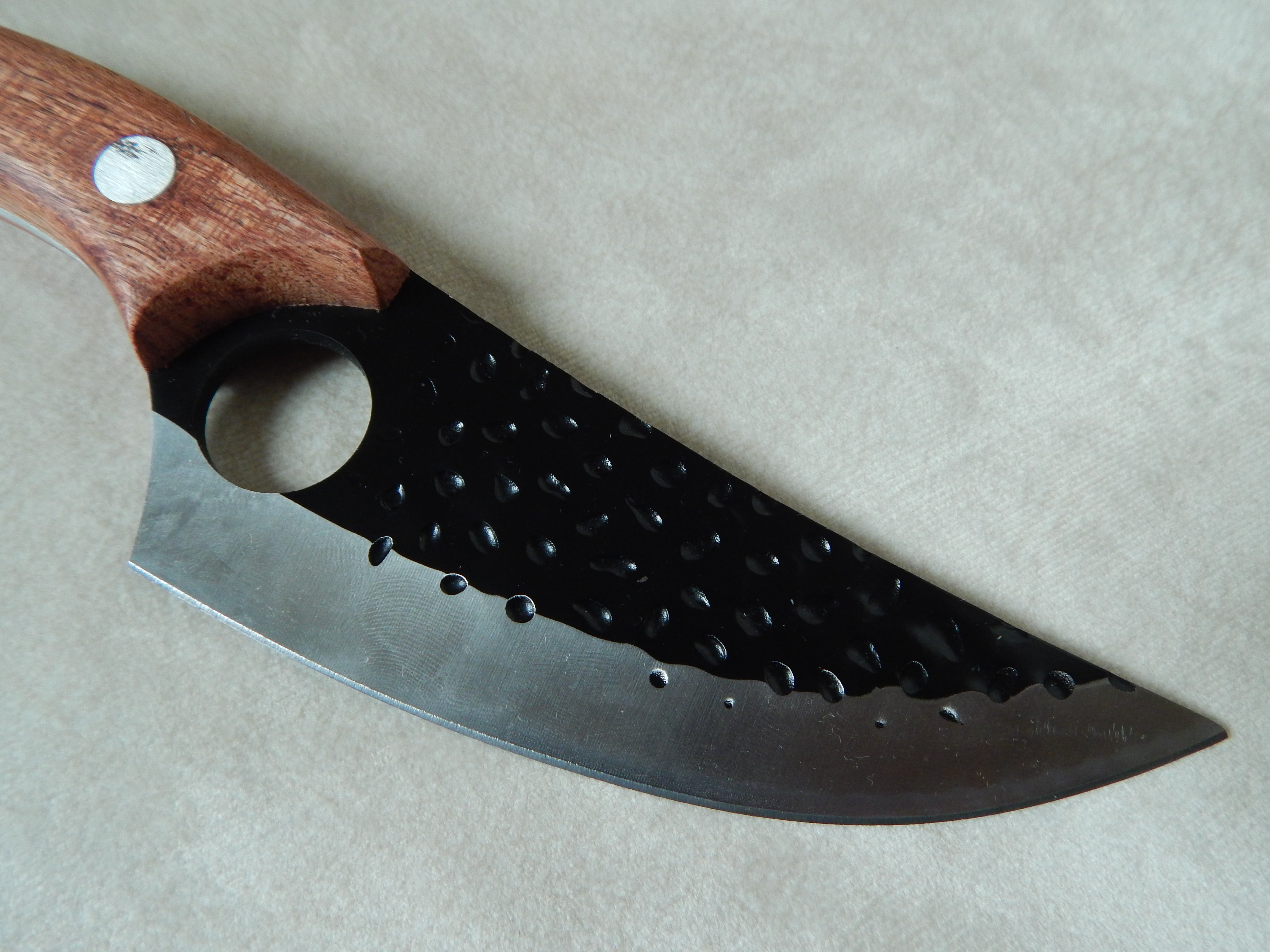 Новый универсальный кухонный и не только нож с отверстием под палец. Нож имеет деревянную ручку которая крепится с помощью 3-х заклепок. Материал лезвия: нержавеющая сталь 5Cr15Mov. Твердость лезвия: 58±2HRC. Отделка лезвия: ручная ковка Материал ручки: дерево + заклепка. Вес около 230 г (один нож) Общая длина - 26 см Толщина обуха в верхней части - 4 мм. Длина лезвия -14 см. Цена - 360 гр.