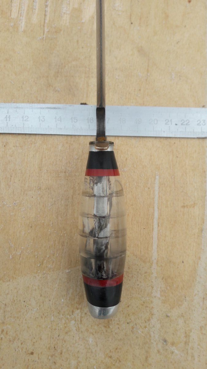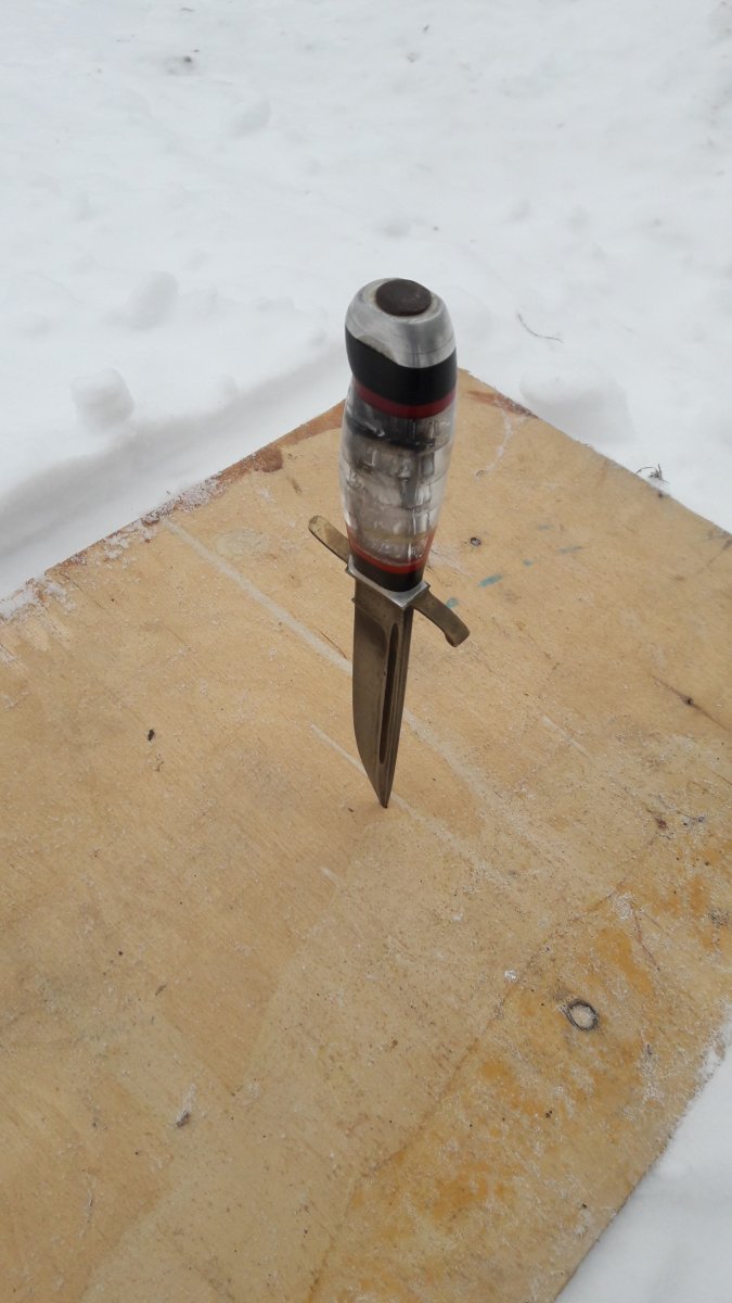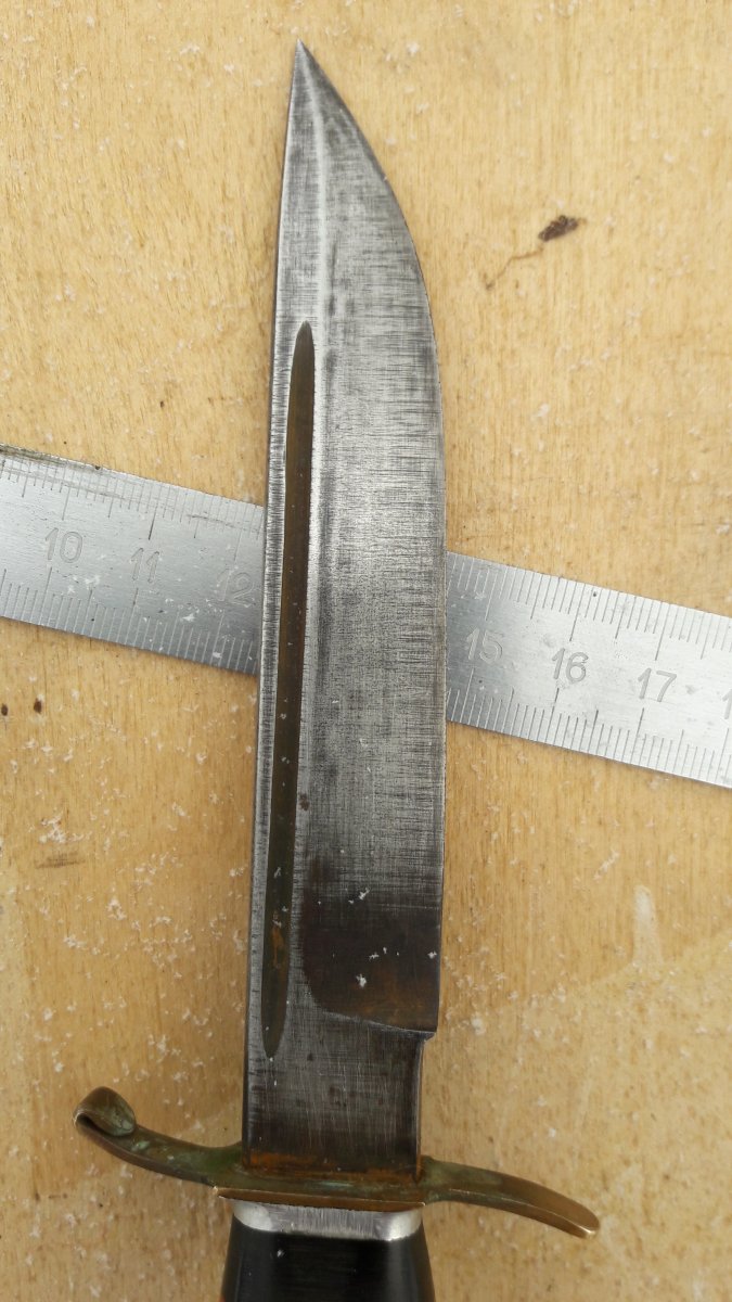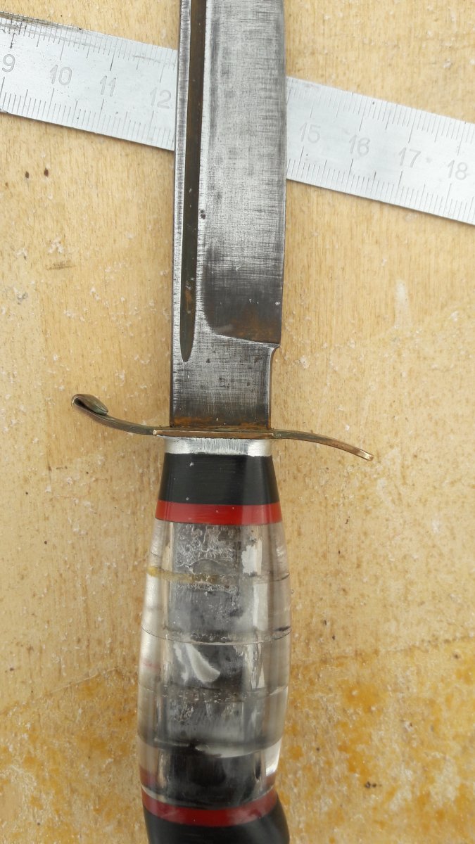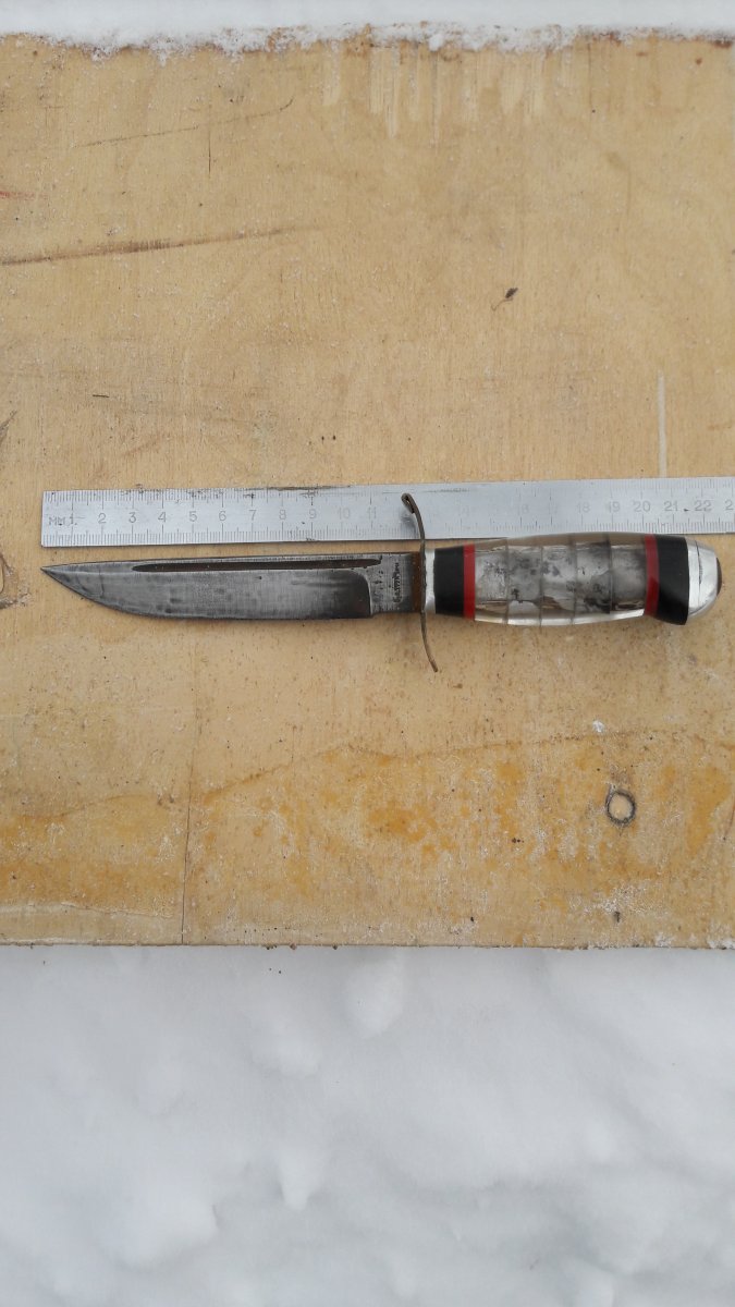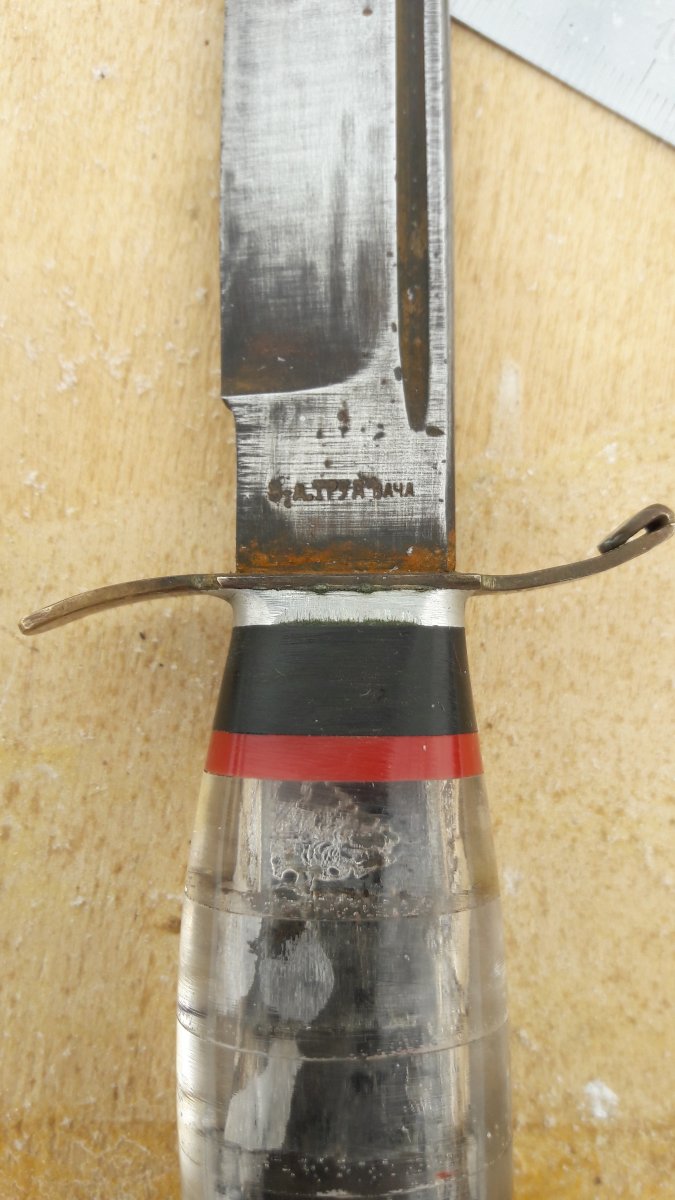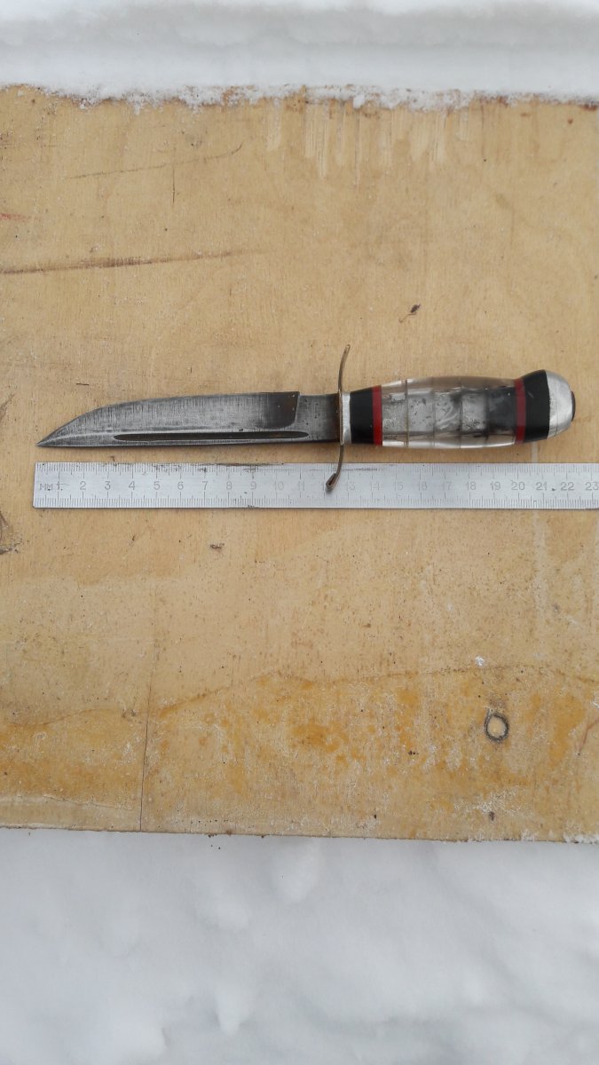 Всем, Доброго... История такова, был сегодня на "блошином", увидел нож (сразу оговорюсь, тема не моя...) и он привлек взгляд. Сначала подумал, что дело рук какого то пионера (рукоять так выглядит..), но когда рассмотрел лезвие, то версия "пионера" сама собой ушла. В руках ощущается вес, а на лезвии есть клеймо... На вопрос, сколько хотят - ответ 100 долларов... Уже собирался идти, но ребята увлекательно рассказали про участника белофинской,....затем увидев во мне слушателя, добавили про сбитый Фокке-Вульф, в рукояти ножа.... и закончили лесником-охотником....(в общем на пару книжек хватит...) На уточняющий вопрос за сколько отдадут, сказали 1000 грн. (наверное внимательно слушал...) Но меня такие перепады в цене настораживают. Но интерес к ножу уже был. За 100 грн., дали сфотографировать (нашли линейку) и обещали придержать до завтра... (хотя, кто его знает, может так зарабатывают...) Даже если с ножом ничего не получится, информацию о нем хотелось бы узнать. Оригинально ли лезвие и клеймо на нем? Кем был нож при своем создании (из ин-та -.... финка/норвежского типа/нквд/охотничий... и т.д.)? Когда мог быть произведен? И стоит ли с ним связываться вообще и за последнюю озвученную сумму, в частности? Спасибо за ответы! С ув. PS.... фото лишь такие....