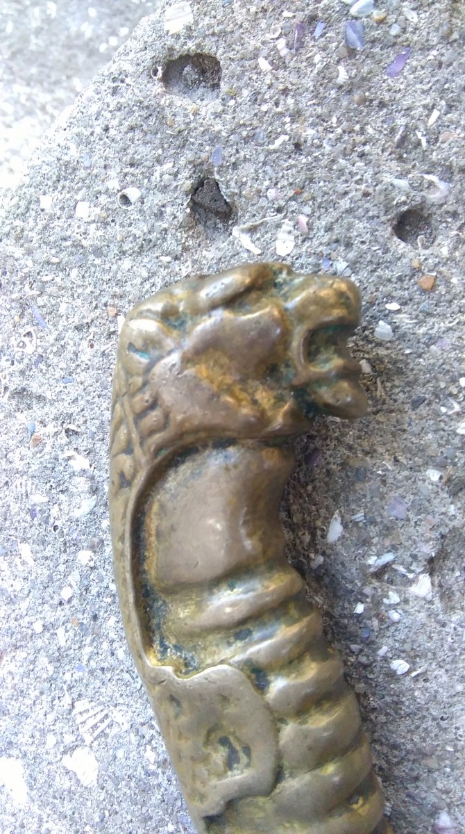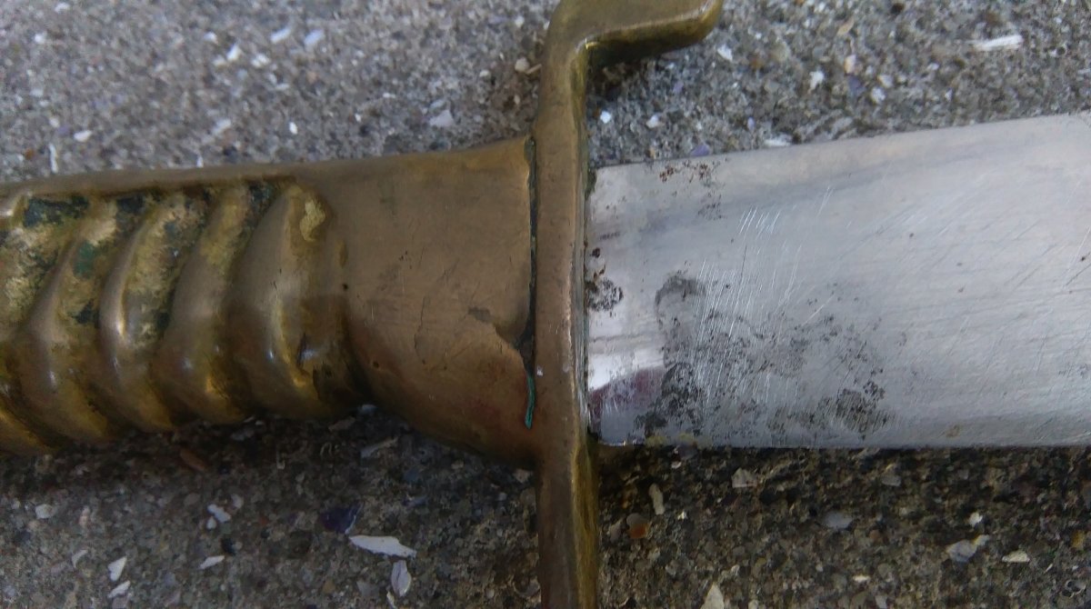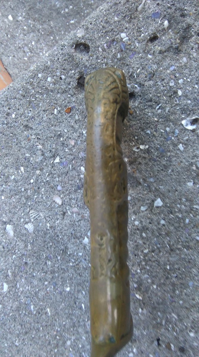 Добрый день, принесли сегодня такой нож, говорят с чердака старого дома, интересует что за нож. Мне видится какой-то рукоблуд. Длина лезвия 16.5 см. Рукоять латунь. Вес 420 грамм. Заранее благодарен