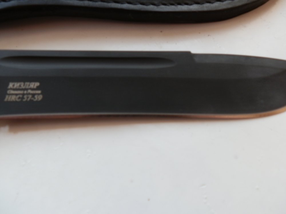 Самур. Нож б/у. Состояние нового. Характеристики Полная длина 277 мм Длина клинка 156 мм Толщина клинка 4.7 мм Геометрия клинка прямой клинок с фальшлезвием и долом Материал клинка сталь Z60CDV14 Обработка клинка хромированный Твердость 56-58 HRC Материал рукояти резинопластик Elastron G Конструкция сквозной монтаж Ножны/чехол поясные ножны из натуральной кожи Вес с ножнами 360 г. Вес без ножен 280 г. Примечание не относится к холодному оружию Нож "Самур" - один из ножей модельного ряда так называемой "речной серии", которая появилась летом 2011 года. Этот нож, как и остальные ножи данной серии, был назван в честь одной из рек. В данном случае в честь реки Самур. Даже беглого взгляда достаточно для того, чтобы понять: перед вами добротный инструмент. Минимум дизайнерских изысков, максимум функциональности и надёжности. "Самур" станет вашим помощником на охоте, рыбалке и в туристическом походе. Он легко справится со всеми возложенными на него задачами. Прост и надёжен как танк - так можно сказать о каждом ноже из "речной серии". На ноже присутствует небольшая гарда, которой вполне достаточно для защиты руки от пореза, в случае внезапного соскальзывания. "Самур" комплектуется ножнами из натуральной ножи, что весьма удобно для транспортировки. Нож "Самур" отличается от ножа "Самур-2" только лишь немного увеличенной гардой. Французская сталь высокого качества, эластрон на рефлённой рукоятке (резинопластик ELASTRON G, используемый для рукоятей кизлярских ножей, прочный как вулканизированный каучук, остается гибким при температурах от -65° до 150°C). Гальваническое покрытие, которое, в основном, используют для защиты стали от коррозии. Наносится поэтапно: первый слой - меднение, второй - белый хром, третий - черный хром. Цена 1150 Терек 2 (рукояти микарта), нож б/у. Состояние нового. Характеристики Полная длина 237 мм Длина клинка 115 мм Толщина клинка 3.2 мм Геометрия клинка S-образное лезвие, выпуклый обух Материал клинка сталь Z60CDV14 Обработка клинка полированный Твердость 56-58 HRC Материал рукояти черная микарта Конструкция плашки приклепаны к хвостовику Ножны/чехол поясные ножны из натуральной кожи Вес с ножнами 365 г. Вес без ножен 280 г. Примечание не относится к холодному оружию Нож "Терек-2" в первую очередь станет отличным выбором для туристов. Впрочем, он подойдет и любителям рыболовной ловли и охотникам. Из-за отсутствия излишней толщины клинка ножом удобно работать на кухне и на рыбалке. Широкий клинок позволяет удобно нарезать продукты большого диаметра. Вы можете брать этот нож в поход, на рыбалку и на охоту. Он комплектуется ножнами из натуральной ножи, что весьма удобно для транспортировки.Гальваническое хромовое покрытие отличается высокой коррозионной стойкостью, однако, и это надо учитывать в повседневной эксплуатации ножей, обладает не высокой устойчивостью к истиранию. Черное хромовое покрытие помимо свойств, отмеченных выше, обладает еще одним специфическим качеством: оно слабо отражает свет (коэффициент отражения света в видимой части спектра составляет 2%, а в инфракрасной -- менее 1%). Поэтому покрытие исключает появление отвлекающих бликов на клинке. Цена 1150 грн