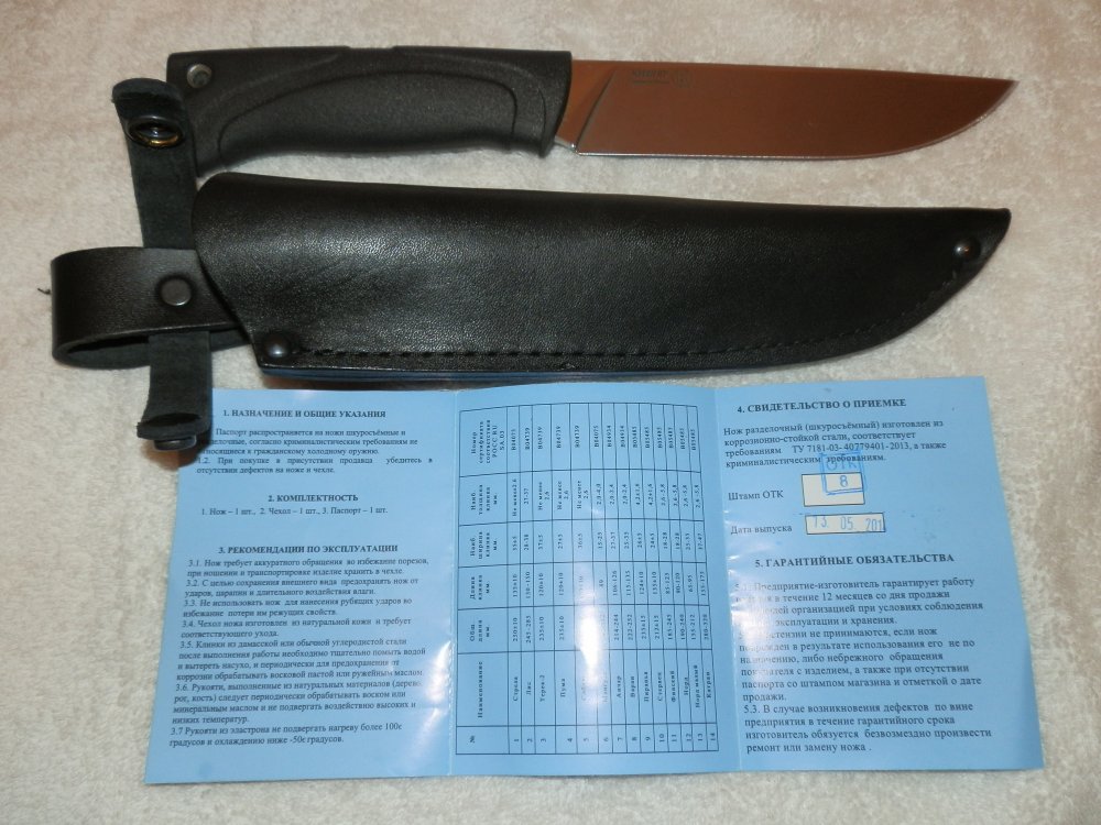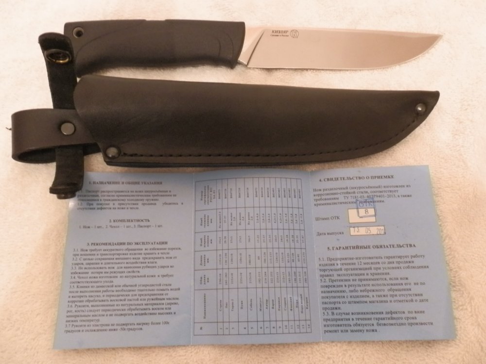 Ножи абсолютно новые, куплены и привезенные из России. Не точились, не правились, ничего не резали. 0505457182 1. Нож ворон-3. Цена 950 грн Нож является представителем ножей милитари серии. Добротные ножи на протяжении десятка лет радуют владельцев своей надежностью. Это не просто нож, а полноценный инструмент, который справляется с очень многими задачами. Причем, как и тяжелыми, походными, так и с кухонными. Если будет такая необходимость. Нож комплектуется ножнами или из натуральной ножи или из АБС пластика - материал с повышенной ударопрочностью и эластичностью. Он нетоксичен, долговечен и устойчив к щелочам и моющим средствам. Влаго-масло-кислотостоек. Эксплуатационные температуры (от -40 °C до +80 °C). Клинок тёмного цвета. Это гальваническое покрытие, которое, в основном, используют для защиты стали от коррозии. Наносится поэтапно: первый слой - меднение, второй - белый хром, третий - черный хром. Гальваническое хромовое покрытие отличается высокой коррозионной стойкостью, однако, и это надо учитывать в повседневной эксплуатации ножей, обладает не высокой устойчивостью к истиранию. Черное хромовое покрытие помимо свойств, отмеченных выше, обладает еще одним специфическим качеством: оно слабо отражает свет (коэффициент отражения света в видимой части спектра составляет 2%, а в инфракрасной -- менее 1%). Поэтому покрытие исключает появление отвлекающих бликов на клинке. Характеристики Полная длина 290 мм Длина клинка 167±5 мм Толщина клинка 4.8±1.5 мм Ширина клинка 31 мм Геометрия клинка копьевидная, выступающее ребро жесткости на голомени клинка Материал клинка сталь Z60CDV14 Обработка клинка хромированный Твердость 56-58 HRC Материал рукояти резинопластик Elastron G Толщина рукояти 23 мм Конструкция черен напрессован на хвостовик, идущий по всей длине рукоятки Ножны/чехол поясные ножны из натуральной кожи Вес с ножнами 358 г. Вес без ножен 242 г. Примечание не относится к холодному оружию http://kizlyar.kiev.ua/catalog/75/112.html 2. Нож Стерх 2. цена 800 грн Нож "Стерх-2" - увесистый инструмент, который поможет справиться со многими задачами в походе. Впрочем, его покупают не только туристы, но и охотники. Идёт в комплектации с ножнами из натуральной кожи. Французская сталь высокого качества, эластрон на рефлённой рукоятке (резинопластик ELASTRON G, используемый для рукоятей кизлярских ножей, прочный как вулканизированный каучук, остается гибким при температурах от -65° до 150°C). Полная длина 269 мм Длина клинка 144±5 мм Толщина клинка 3.6±1.5 мм Ширина клинка 31 мм Геометрия клинка прямая, со слегка изогнутым к острию обухом Материал клинка сталь Z60CDV14 Обработка клинка полированный Твердость 56-58 HRC Материал рукояти резинопластик Elastron G Толщина рукояти 22 мм Конструкция черен напрессован на хвостовик, идущий по всей длине рукоятки Ножны/чехол поясные ножны из натуральной кожи Вес с ножнами 253 г. Вес без ножен 183 г. Примечание не относится к холодному оружию http://kizlyar.kiev.ua/catalog/75/150.html