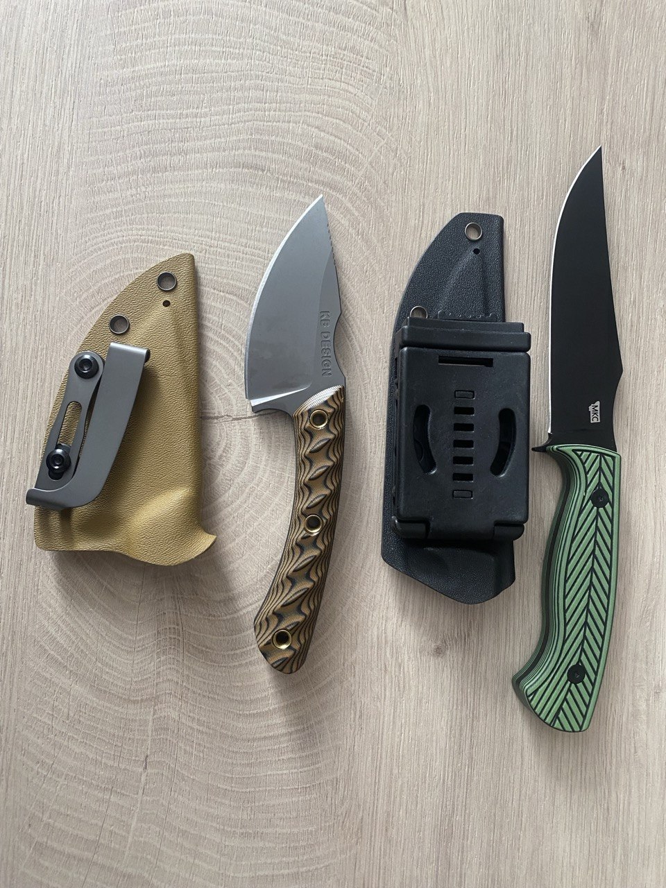 Нож МКС Новый, в масле Общая длина: 24,5 см Длина клинка: 12 см Клинок: 3 мм. Сталь: 8Cr13Mov. Материал рукояти: двухцветный, G10. Вес ножа: 173 г. Ножны: Кайдекс. Цена: 2200 грн. Нож RMJ Новый, в масле Общая длина клинка: 18,5 см. Длина клинка: 9,1 см. Обух: 5 мм. Сталь: 8Cr13MoV Материал рукояти: G10. Вес с ножнами: 150 г. Цена: 1200 грн.