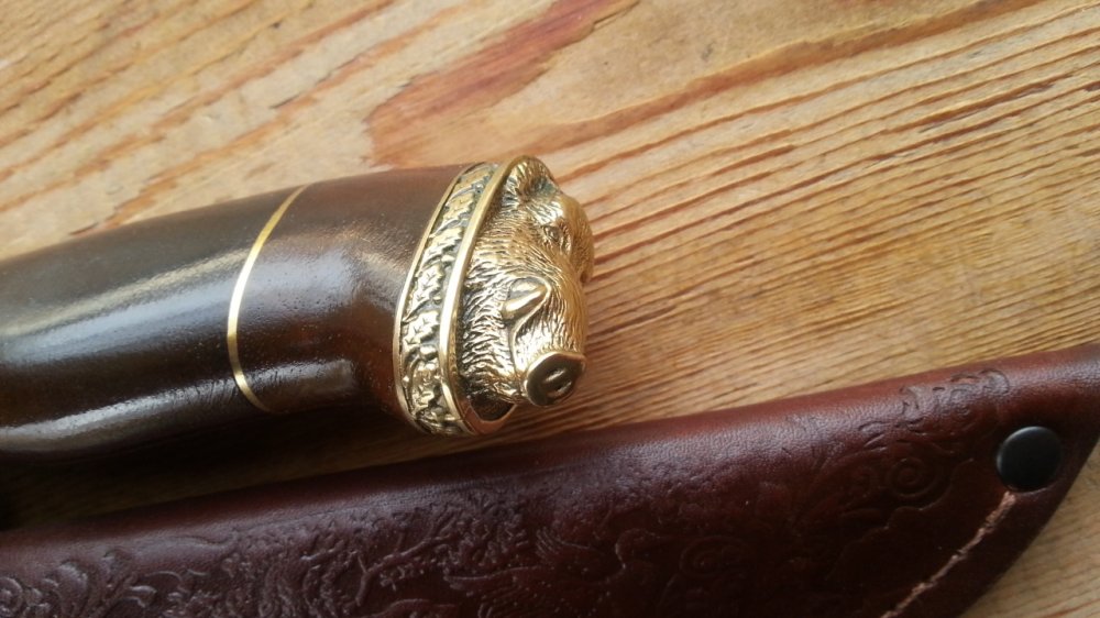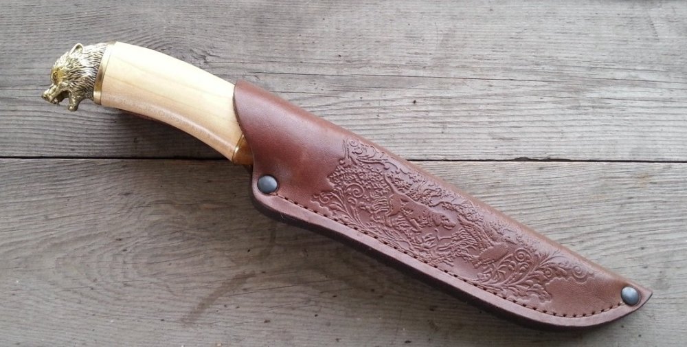Нож Медведь Бренд: "GRAND WAY" Сделано в Украине (ручная работа) Общая длина, мм: 275 Длина рукояти, мм: 135 Длина лезвия, мм: 140 Толщина лезвия, мм: 2,4 Покрытие лезвия: Mirror Polish Материал лезвия: 65X13 Твёрдость стали: 56-58 HRC Материал рукояти: дерево, латунь Материал чехла: кожа
