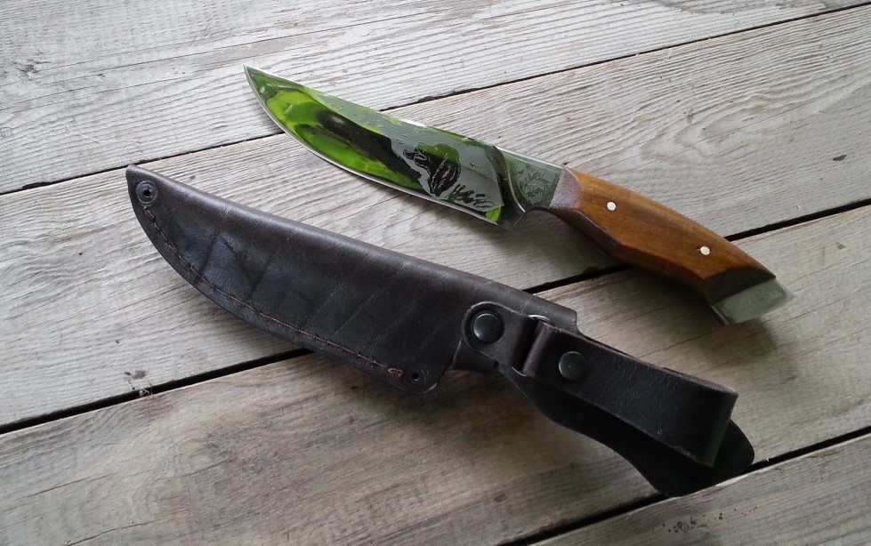 Вой Сделано в Украине (ручная работа) Общая длина, мм: 290 Длина рукояти, мм: 130 Длина лезвия,мм: 160 Материал лезвия: 40X13 Толщина лезвия, мм: 2,3-2,45 Вес ножа, г: 205 Покрытие лезвия: Mirror Polish Твёрдость стали: 54-56 HRC Материал рукояти: дерево, металл Материал чехла: кожа