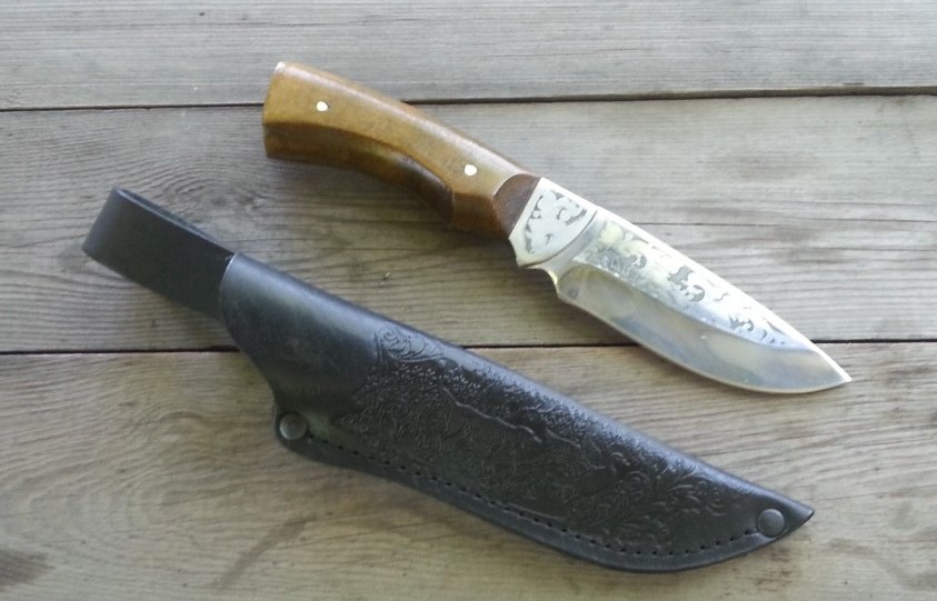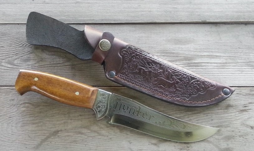 ОХОТНИК Общая длина, мм: 243 Длина рукояти, мм: 115 Длина лезвия, мм: 128 Материал лезвия: 65X13 Толщина лезвия, мм: 2,3-2,45 Покрытие лезвия: Mirror Polish Твёрдость стали: 56-58 HRC Материал рукояти: дерево Материал чехла: кожа