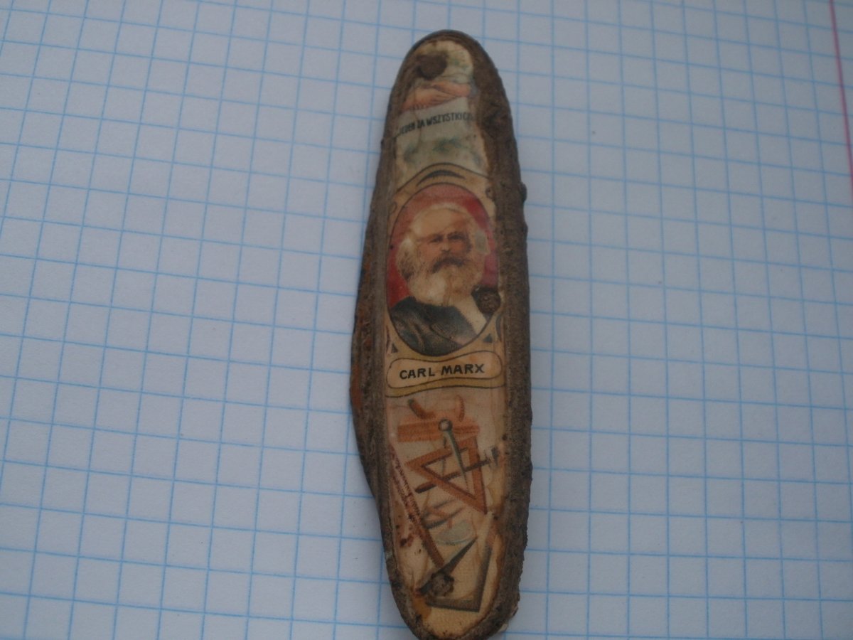 Приветствую. Вчера нашёл интересный польский раскладной ножичек с изображением вечных революционеров карла маркса и ф. лассалле и лозунгом на польском языке jeden za wszystkich wszyscy za jednego.Одна из боковых частей отслоилась. Предположительно для изображений использовался материал -- целлулоид. Металл лезвия не нержавейка, но по виду крепкая сталь. Слегка почистил от земли, не открывал. Найден около окопчика, сопутка и современщина и старовина. Интересно это занесло сюда как-то во времена ссср или эта находка относиться к межвоенной польши? И есть ли смысл выставлять на аукцион? С ув.
