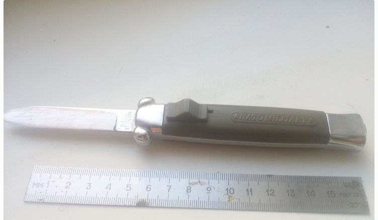 Требует более тщательной чистки . По таким фото возможно два варианта . 1. это гравитационный нож . Кнопка выводила зуб из отверстия в лезвии или клавиша открывала окошко в рукояти , движение рукой вниз и лезвие выпадало под действием силы тяжести . 2. имитация ( или нет ) выкидухи "нато милитари " . Производитель клинка изготовитель металлоконструкций из Австралии .