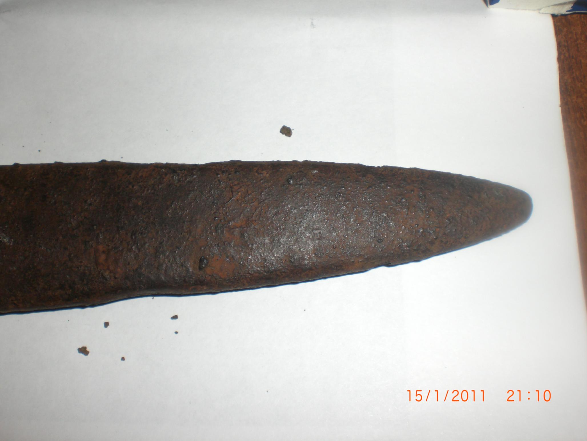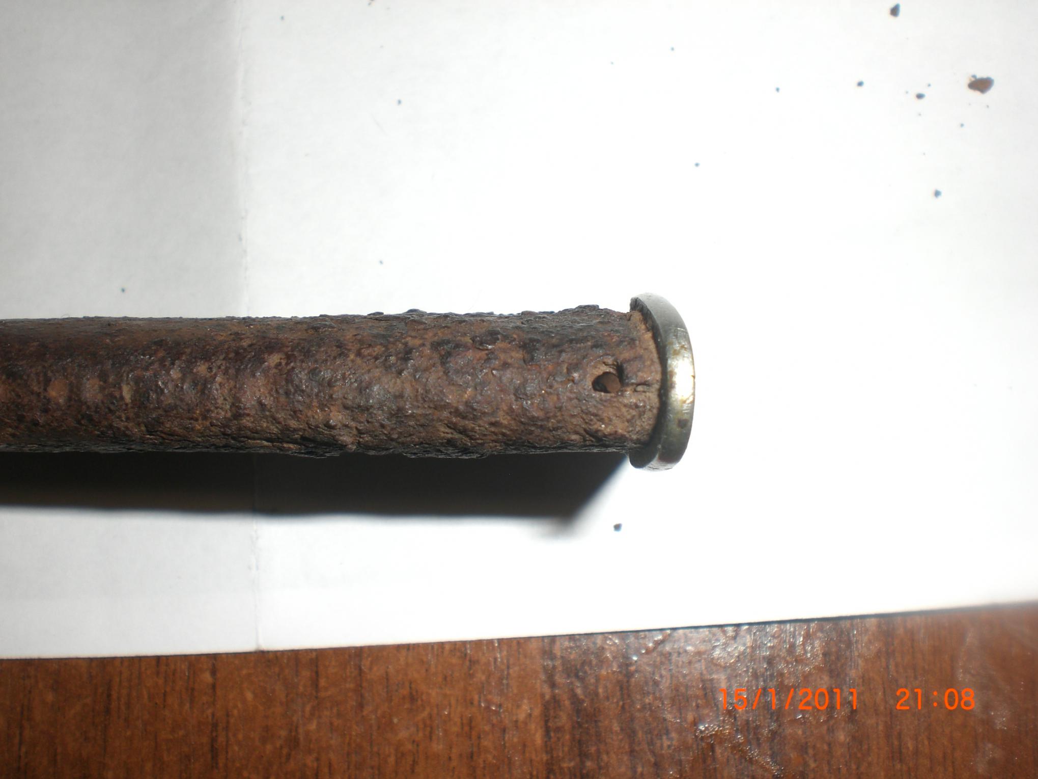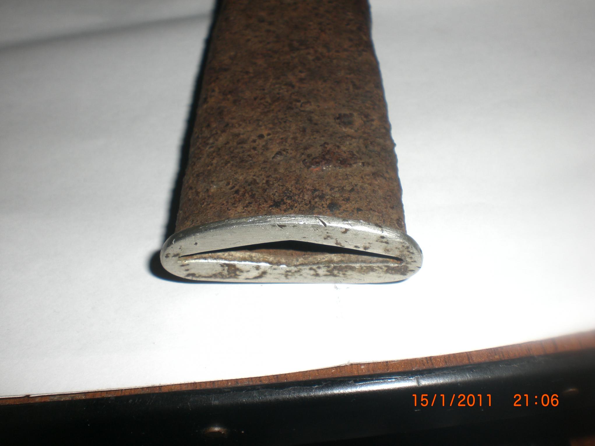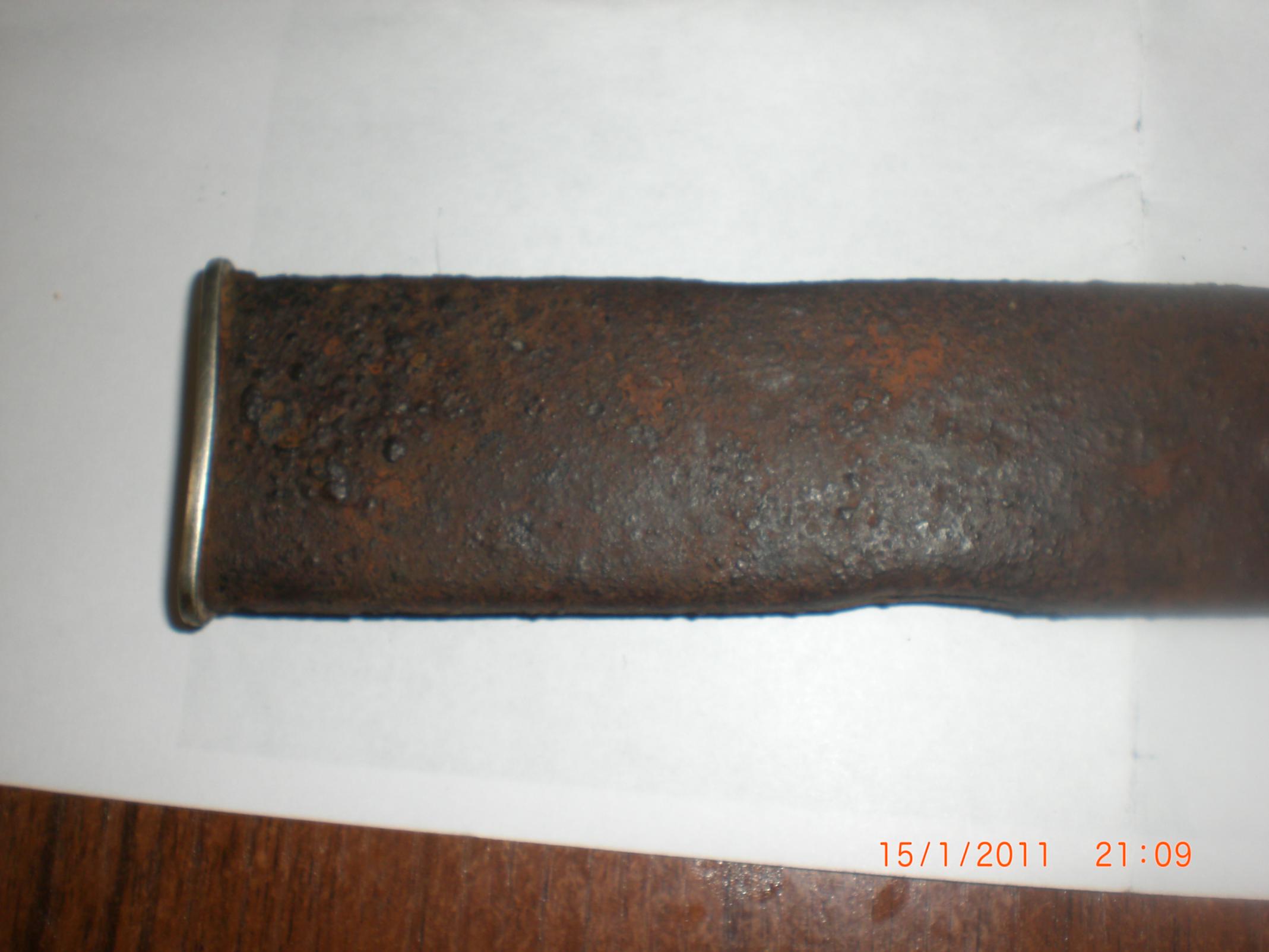 При восстановлении вес шпаклёвки будет превышать вес самих ноженЧего в этих ножнах ценного,так это устье с пружиной!Предмет похоже был ранний и устье изготовлено из нойзильбера,а пружины -латунь!Потому и сохранилась сия запчасть!Только из за этого 15 баксов,сами штаны на выкидон!