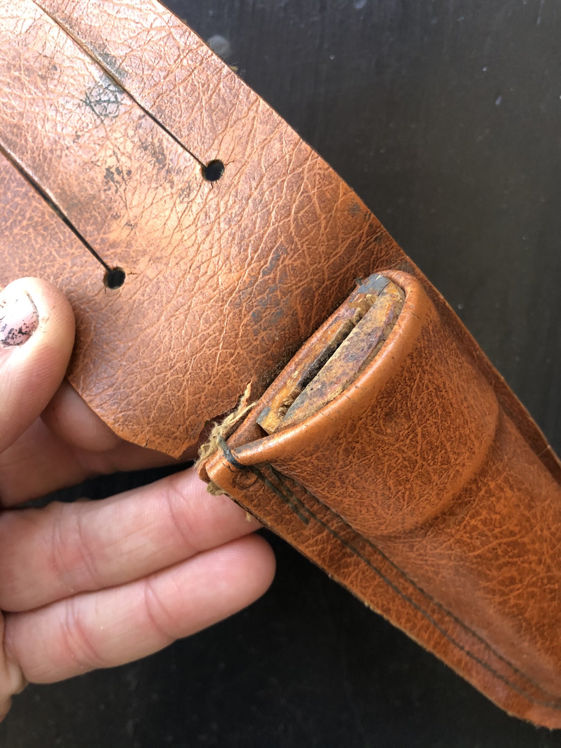 В наличии 3 ножны Всё ручной работы, кожа Ножны б.у 1.Коричневая с деревянной вставкой( есть надрыв) - идеально под ходит под нож козья лапка. Цена:100грн 2. Чёрная ножна. Цена:50грн 3. коричневая(4 заклепки) Цена: 200грн