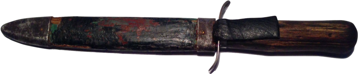 По поводу металлических ножен сложно сказать, думаю всякое было в "окопах"..... Но всё-же к данному типу ножей основные ножны были или кожанные, или деревянные крашенные с металлическим эфесом. Вот пример оригинального ножа в отличном сохране, с оригинальными ножнами. Производства Дьяковской артели.