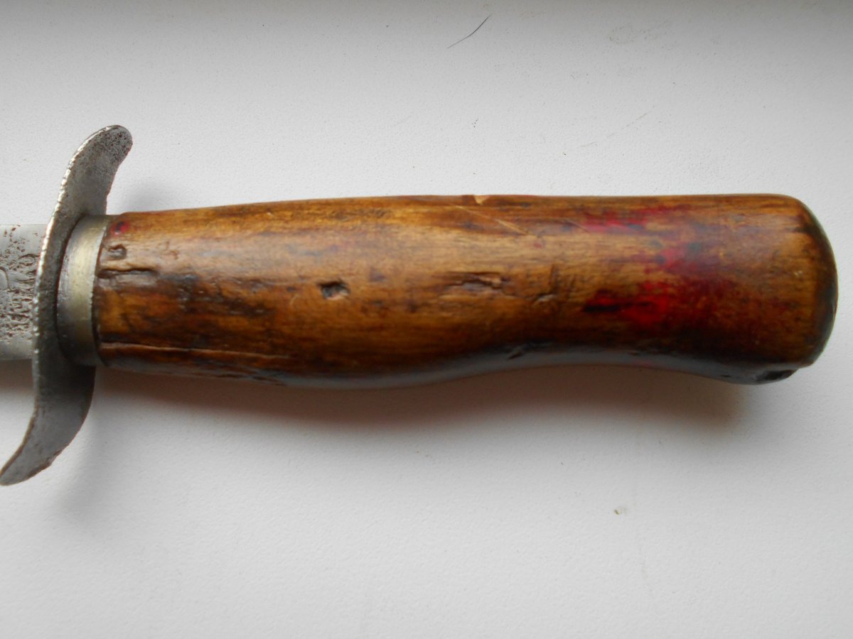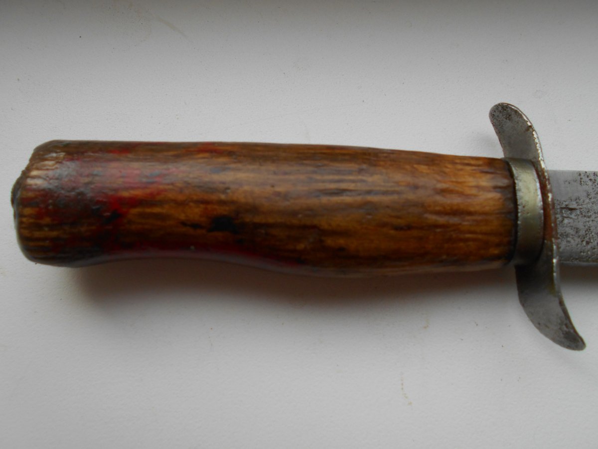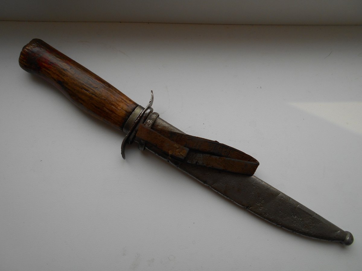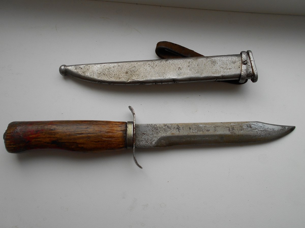 из личной коллекции. на клинке клеймо ИМЗ. дерево в отличном состоянии, не рассохлось, . клинок острый, хоть сейчас в бой. ножны были сделаны из ножен трофейного штык-ножа арисака. в ножнах нож сидит плотно. интересная деталь, это зарубки на ножнах явно не случайного характера. думаю, зарубки на этих ножнах сравни звёздочкам за сбитые вражеские самолёты. 3000грн.