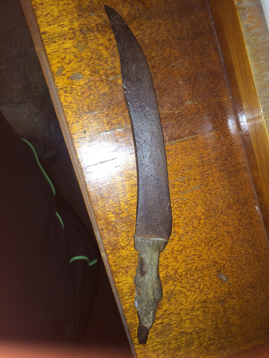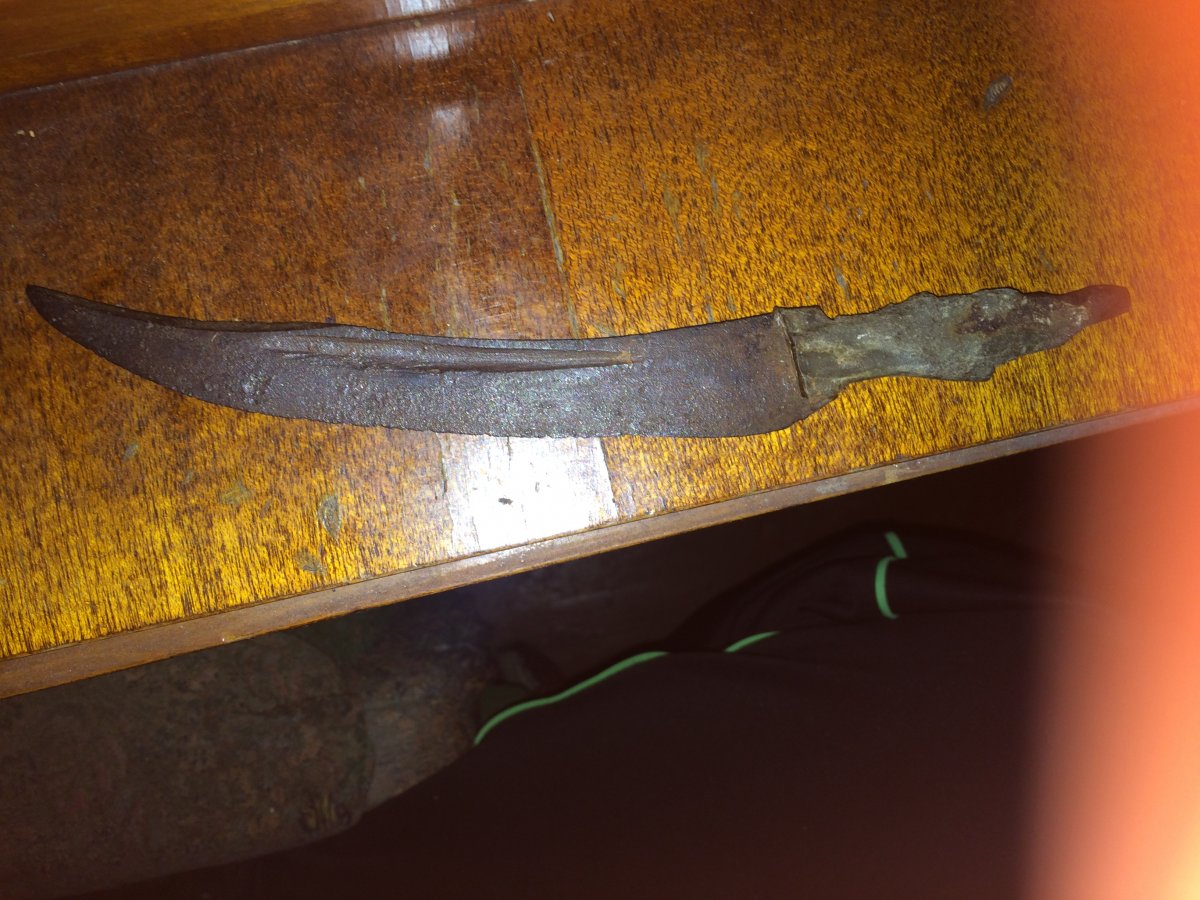 Изделие безумного ПТУ-шника с кривыми руками! Ни высечь форму клинка из листа на вырубной машине не сумел, ни шлифмашинкой дол изобразить! Из какого гуано рукоять? Свинец-олово? Помнится в 78-80 гг. прошлого века пацаны во дворе тырилиу родителей кухонники, снимали с них дерево, и с помощью формы в гипсе свинцом или оловом выливали новую ручку в виде русалки с сиськами. Кажется это с той же оперы.