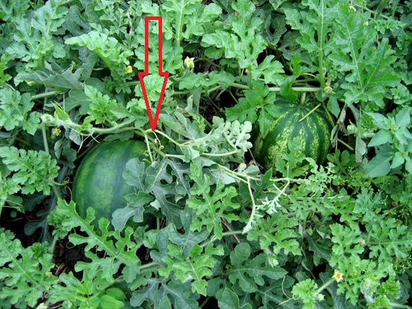 Та то трохі не так - тоненький сухий хвостик , покручений як у поросяток , то біля самої плодоніжки , котра може бути товста й дебела навіть зелена а кавун спілий та смачнющий. Саме цей "хвостик" мається на увазі при визначенні спілості кавуна . Але то всьо фігня коли нема баштану поряд шоби подивитись на сам огуд - бо цей "індикаторний" хвостик не на кавунячий плодоніжці , а на самій огудині і в маркетах його ніц не побачиш там кавуни без ботви . Осьо де стрілка показує - то саме той "індикаторний" хвостик безпосередньо біля самої плодоніжки кавуна , котрий повинен бути як не зовсім сухим - так крєпко зів'ялим .