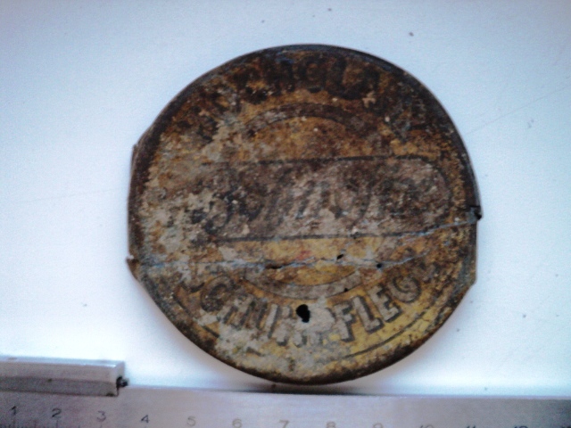 Попался такой обломок с интересным рисунком. Женская нога нажимает на что-то. От чего это? И цинковая крышка непонятная, то ли по войне, то ли современный мусор. От чего она?