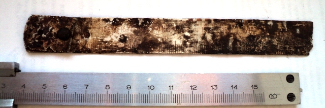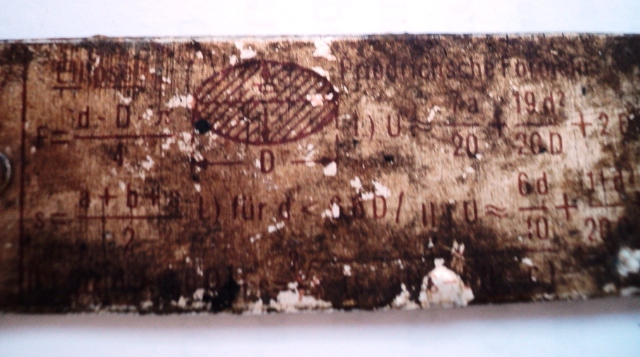 Состояла из двух пластин, соединенных клепкой по типу ложко-вилки. Нашел только одну пластину с обломком второй.С внутренней стороны линейка со странными обозначениями. Шкала в см начинается с 152 и далее возрастает. Здесь же указан масштаб 1:2500 и риски с нумерацией 0, 10, 20, 30, 40, 50. Кроме того между некоторыми сантиметровыми обозначениями видны числа 201, 214. С обратной стороны формулы с рисунками и надписями на немецком. Рядом найдена крышка от немецкой танковой рации, нагрудный орел и орел с фуражки. Что это была за линейка? Студента?