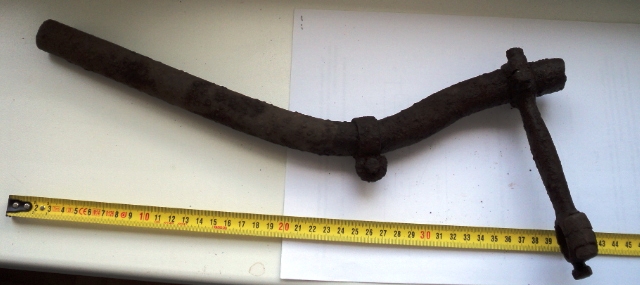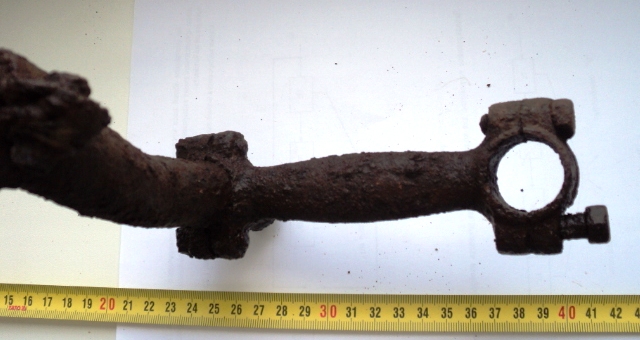 Вырыл в лесу такой предмет. Если мысленно добавить вторую половинку, то видится руль от мото или вело. Даже хомутик от звонка присутствует. Но крепление какое-то странное получается. Что это может быть?