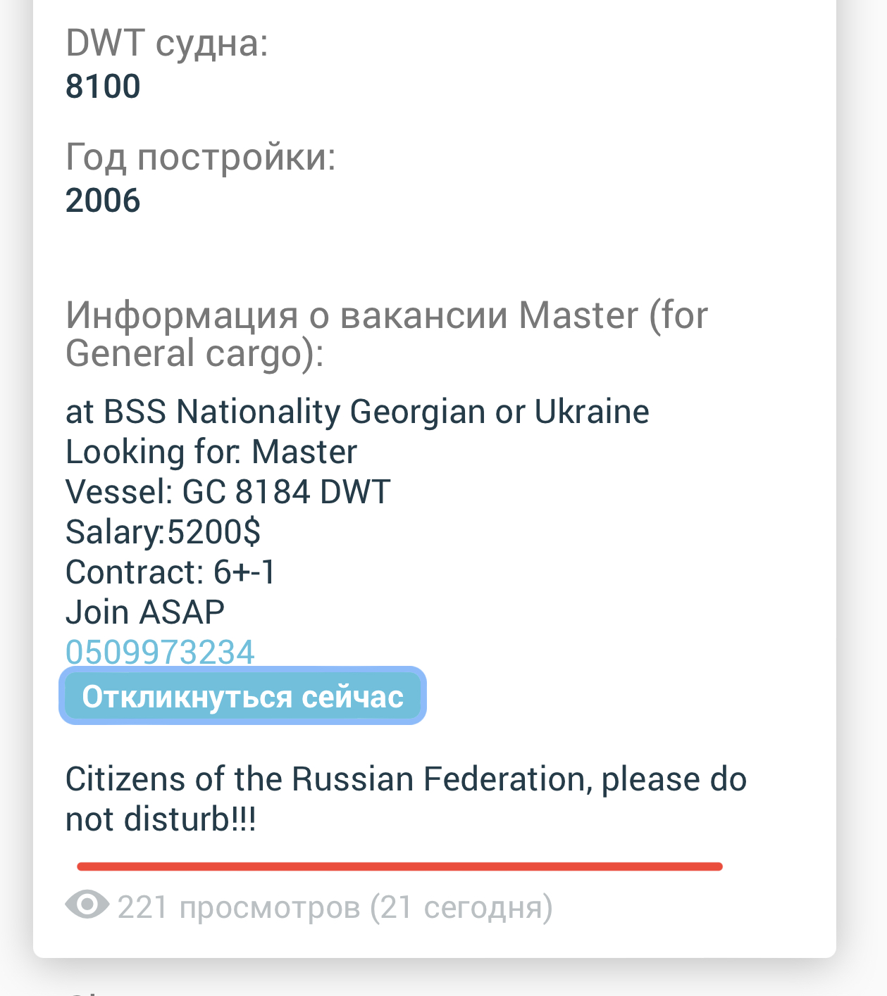 Не совсем так… Сейчас тенденция запросов судовладельцев - отгородится от россиян. Если не полностью, то хотя бы частично. Работа с ними это токсично. Имидж там в приоритете. И не забывайте о том, что компании хотят экипажи с открытой С1/В1 US visa. А лавочку для трехцветных прикрыли.
