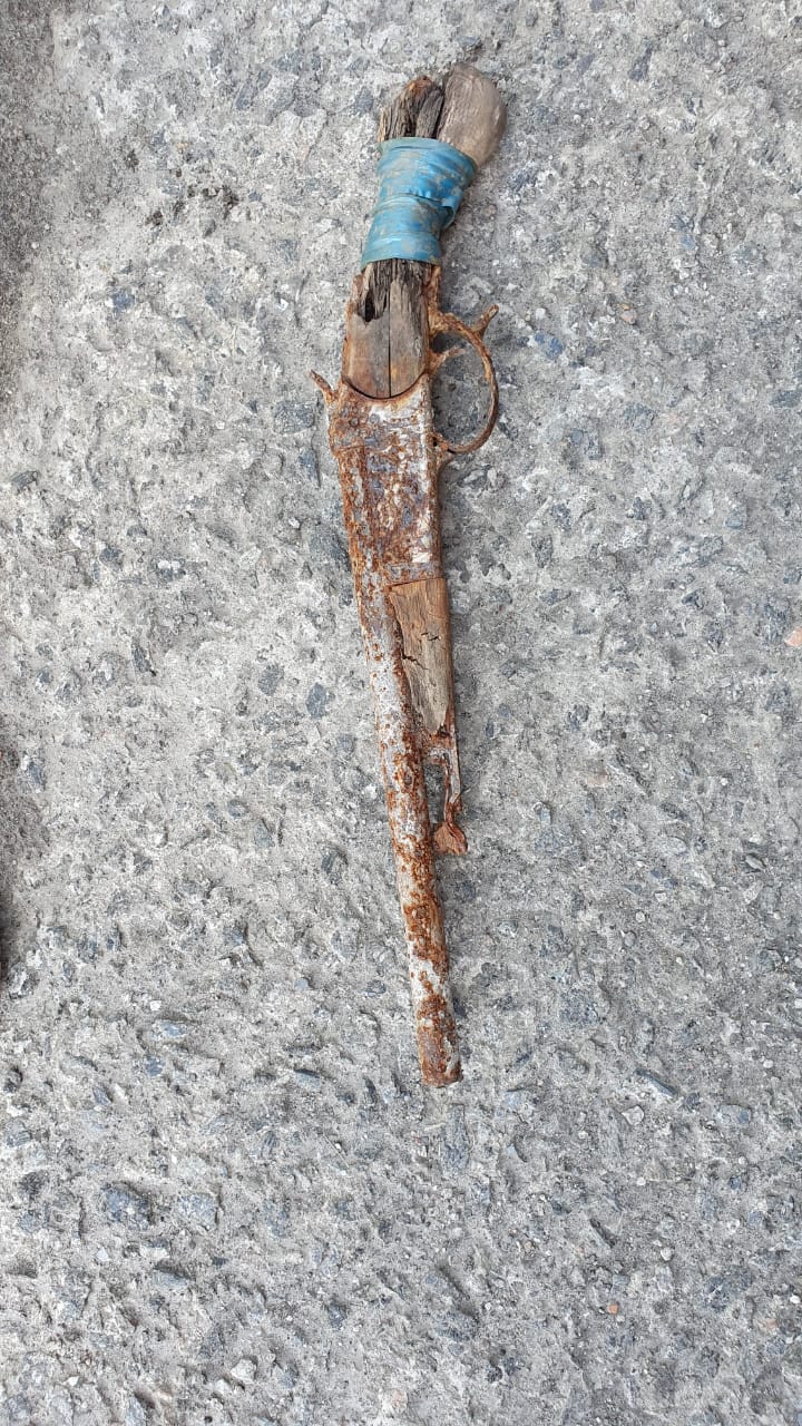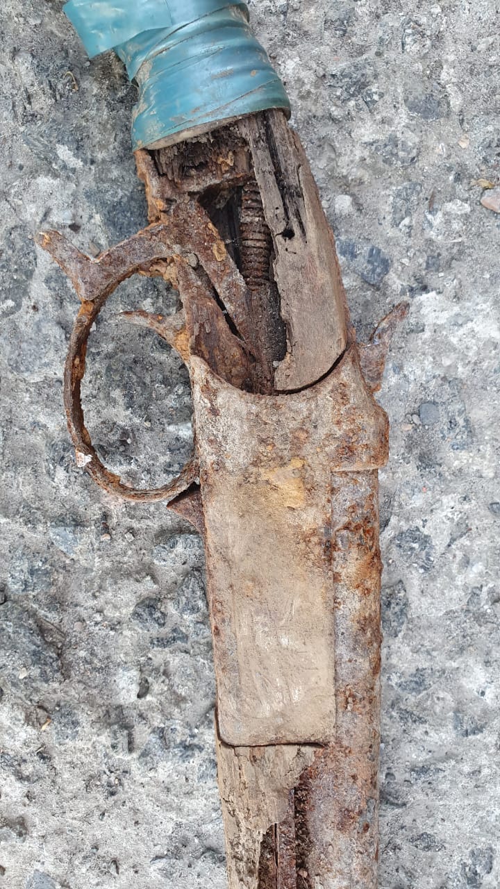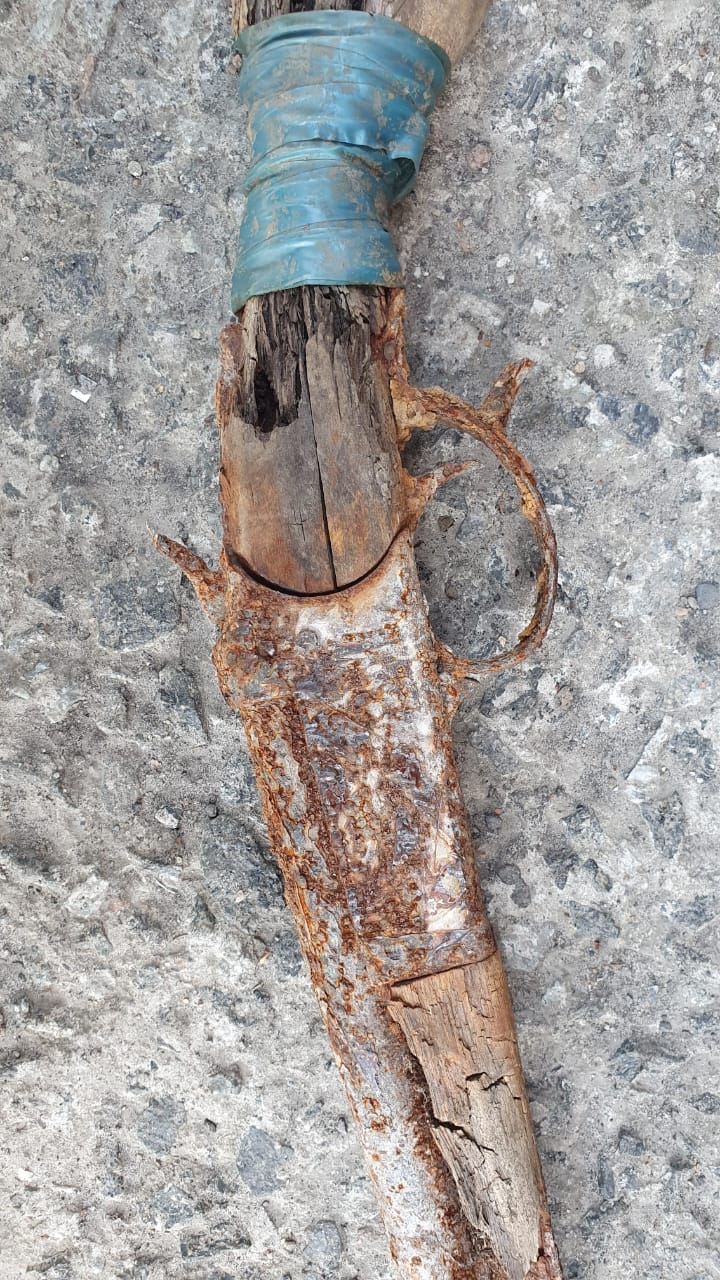 Обрез одноствольного ружья, производства ИЖевск. Могу ошибаться, но похоже на на ИЖ 3К. Синяя изолента это + 100 к мощности . Либо замотали из-за плохо обрезаного дерева либо трещины.