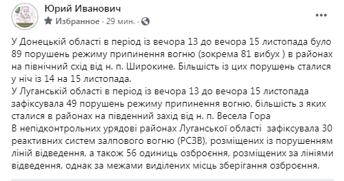 Отчёт миссии ОБСЕ за 19.11-20.11.2020 г. ОБСЕ сегодня сообщила, что патруль Специальной мониторинговой миссии заметил у Новоамвросиевского (ОРДО) реактивную систему залпового огня БМ-21 «Град». А беспилотный летательный аппарат СММ малого радиуса действия обнаружил около сорока противотанковых мин между оккупированными прифронтовыми Пикузами (Коминтерново) и Заиченко под Мариуполем.