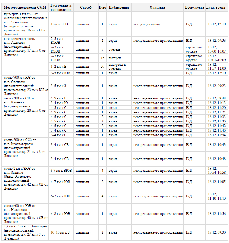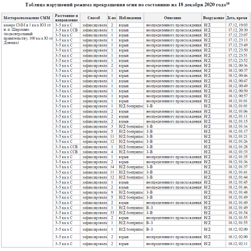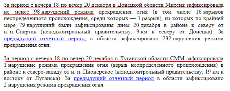 ОБСЕ зафиксировала более 80 нарушений на Донбассе за сутки Специальная мониторинговая миссия (СММ) ОБСЕ зафиксировала 84 нарушения на Донбассе за сутки 17 декабря. Большинство из них в Донецкой области. Об этом говорится в отчете СММ ОБСЕ. Так, в Донецкой области было зафиксировано 63 нарушения. Среди них - 30 взрывов неопределенного происхождения вблизи Широкино и 19 взрывов вблизи Донецкой фильтровальной станции. В течение предыдущего отчетного периода в области зафиксировано 28 нарушений режима прекращения огня. В Луганской области СММ зафиксировала 21 нарушение режима прекращения огня. В течение предыдущего отчетного периода в области зафиксировано 18 нарушений режима прекращения огня.