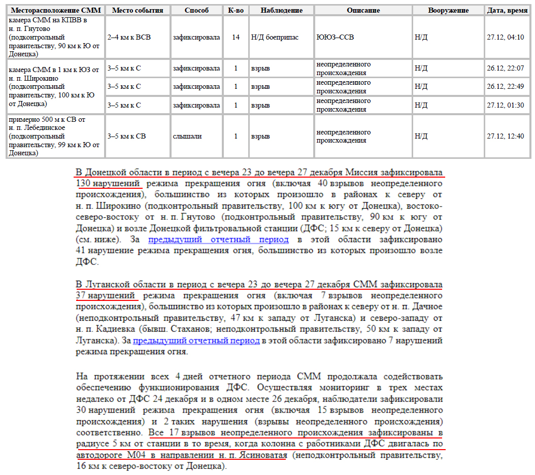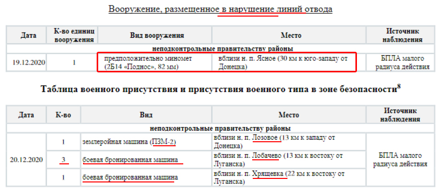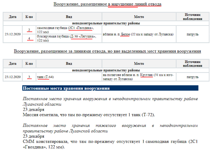 Українська сторона СЦКК Українська сторона СЦКК повідомляє про грубі порушення з боку збройних формувань РФ та її найманців. Так, 27 грудня БПЛА середнього радіуса дії СММ ОБСЄ зафіксував 1 од. 122 мм гаубицю Д-30 поблизу населеного пункту Ставки, а 28 грудня БПЛА дальнього радіуса дії Місії зафіксував 23 од. реактивних систем залпового вогню БМ-21 “Град”, я з яких 2 од. на полігоні поблизу населеного пункту Міусинськ та 21 од. поблизу населеного пункту Хрустальний. Все зазначене озброєння розміщене з порушеннями лінії відведення, про що йдеться у Звіті СММ ОБСЄ від 30 грудня 2020 року. У тому ж Звіті зазначається, що 28 грудня БПЛА дальнього радіуса дії СММ ОБСЄ зафіксував 60 од. озброєння, розміщеного за лініями відведення, але поза межами виділених місць зберігання, а саме: 35 од. на полігоні поблизу н.п. Мирне та ще 25 од. на полігоні поблизу н.п. Міусинськ. Вищезазначені факти свідчать про те, що представники збройних формувань РФ продовжують демонструвати небажання виконувати раніше досягнуті домовленості.