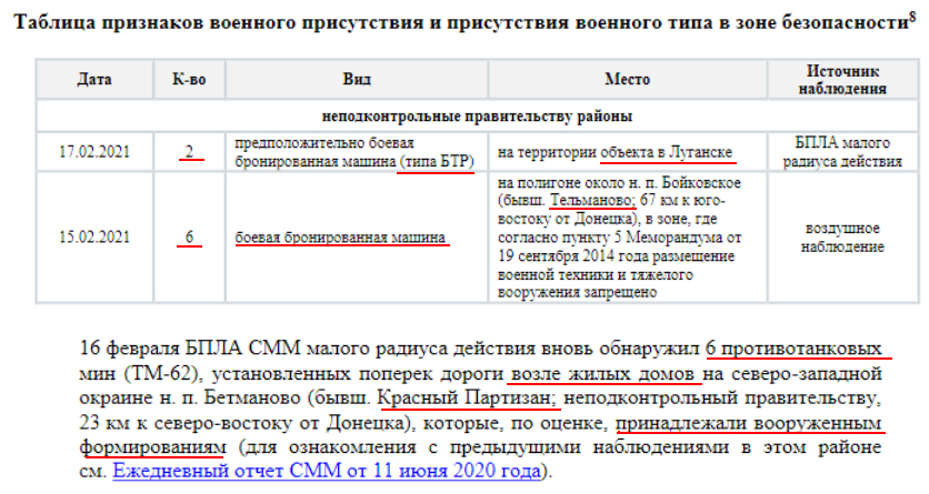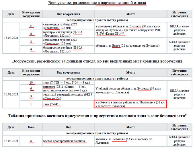 На тимчасово окупованому Донбасі понад 170 одиниць техніки розміщені з порушенням – ОБСЄ Спеціальна моніторингова місія ОБСЄ зафіксувала на полігонах російських окупаційних військ на Донбасі 174 одиниці озброєння та техніки, що розміщені поза виділеними місцями зберігання озброєння. Про це повідомляється у щоденному звіті №49/2021, опублікованому СММ ОБСЄ в Україні 2 березня, повідомляє Укрінформ. Відповідно до даних повітряного спостереження від 23 лютого, на полігоні поблизу н. п. Мирне (28 км на південний захід від Луганська) було виявлено 21 танк, 11 самохідних гаубиць і мінометів, 10 буксированих гаубиць/мінометів. Крім того, на цьому ж полігоні російських окупаційних військ розміщувалися 56 бойових броньованих машин, які не підпадають під дію Мінських угод щодо відведення озброєння. Ще 17 танків було зафіксовано дроном Місії ОБСЄ на полігоні поблизу н. п. Тернове (57 км на схід від Донецька). За інформацією спостерігачів, на полігоні збройних формувань РФ поблизу н. п. Круглик (31 км на південний захід від Луганська) виявили 32 танки. Також на полігоні поблизу Міусинська (62 км на південний захід від Луганська) було зафіксовано 12 танків, 20 самохідних гаубиць/мінометів, 7 зенітних ракетних комплексів, 25 буксированих гаубиць/мінометів. Окрім того, тут було виявлено наявність ще 46 броньованих бойових машин. Безпілотник СММ ОБСЄ також виявив 12 танків на полігоні поблизу н. п. Бугаївка (63 км на південний захід від Луганська). Там же, за даними повітряного спостереження, виявлено ще 63 броньовані бойові машини.